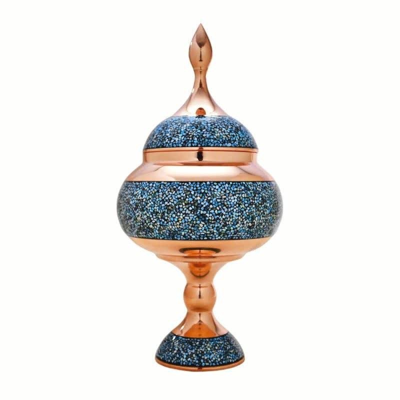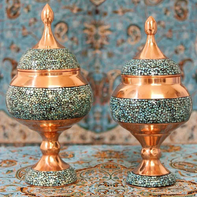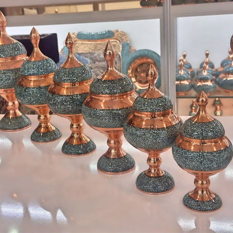 شکلات خوری های فیروزه کوبی دارای سایزبندی مختلف است: شکلات خوری 16 (Mini Delight): ارتفاع 16 سانت و قطر دهانه 8.5 سانت – مناسب برای دکورهای کوچک و فضاهای شخصی. شکلات خوری 18 (Tiny Treasure): ارتفاع 20 سانت و قطر دهانه 9.5 سانت – انتخابی زیبا برای پذیرایی دوستانه و خصوصی. شکلات خوری 20 (Petite Elegance): ارتفاع 23 سانت و قطر دهانه 11.5 سانت – ایدهآل برای مهمانیهای صمیمی و مجالس کوچک. شکلات خوری 22 (Classic Charm): ارتفاع 25 سانت و قطر دهانه 14 سانت – گزینهای عالی برای مجالس رسمی و بزرگ. شکلات خوری 25 (Grand Glory): ارتفاع 28 سانت و قطر دهانه 15.5 سانت – ترکیبی از زیبایی و بزرگی برای محیطهای لوکس. شکلات خوری 28 (Majestic Presence): ارتفاع 38 سانت و قطر دهانه 20 سانت – جلوهای عالی برای سالنهای پذیرایی و دفاتر کاری. شکلات خوری 30 (Supreme Elegance): ارتفاع 42 سانت و قطر دهانه 22 سانت – انتخابی فاخر برای فضای بزرگ و پذیراییهای خاص. شکلات خوری 35 (Regal Prestige): ارتفاع 50 سانت و قطر دهانه 26 سانت – شاهکار هنری برای نمایش در بهترین مکانهای منزل یا محل کار. شکلات خوری 45 (Royal Delight): ارتفاع 60 سانت و قطر دهانه 32 سانت – گزینهای لوکس و منحصر به فرد برای مکانهای خاص و بزرگ. مزایای خرید شکلات خوری فیروزه کوبی بدون واسطه از برند بته چی: کیفیت ساخت بالا: استفاده از مس مرغوب و سنگهای فیروزه اصل، دوام و درخشندگی بالایی را تضمین میکند. طراحی چشمنواز: چیدمان دقیق فیروزهها روی مس، همراه با پرداخت ظریف، این محصول را به یک اثر هنری خاص تبدیل کرده است. کاربردی و تزیینی: علاوه بر استفاده در پذیرایی، بهعنوان یک قطعه دکوراتیو شیک نیز جلوهای زیبا به محیط میدهد. انتخابی عالی برای هدیه: به دلیل ظاهر فاخر و ارزش بالای مواد بهکاررفته، گزینهای ایدهآل برای هدایا و مناسبتهای خاص محسوب میشود. ضمانت و اطمینان از خرید: در مجموعه صنایع دستی بُته چی، محصولات فیروزهکوبی با ضمانت اصالت و کیفیت به همراه ضمانتنامه 48 ماهه عرضه میشوند. نکات مهم نگهداری از شکلات خوری فیروزه کوبی: برای تمیز کردن شکلات خوری مس و فیروزه از دستمال تمیز خشک یا نانو استفاده کنید و نیاز به شستشو با آب نیست. روکش پلی استر روی ظرف باعث داوم، زیبایی و مراقبت از مس آن میشود و از اکسیدشدن مس جلوگیری میکند. از گرما و آفتاب، مواد شوینده و شیمیایی و اجسام نوک تیز دور نگه داشته شود تا پلی استر آن آسیب نبیند.