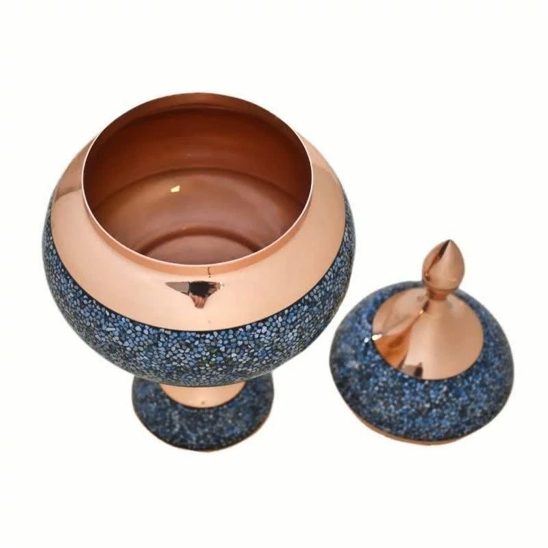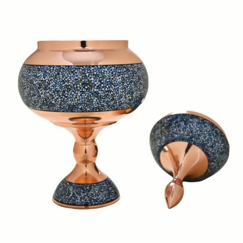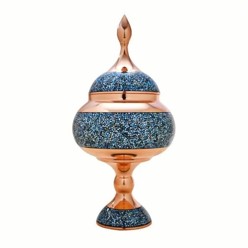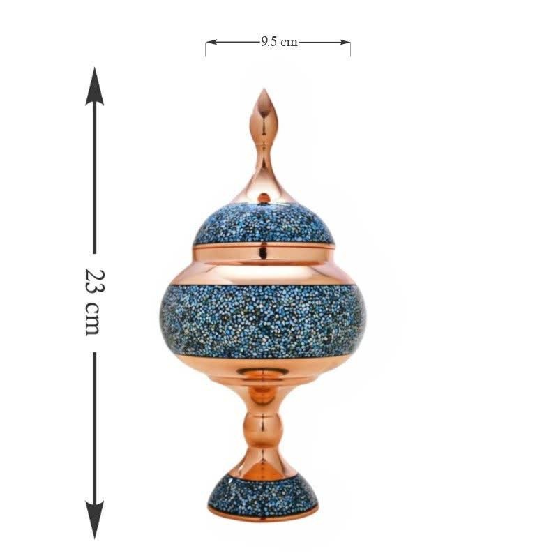شکلات خوری متوسط فیروزه کوبی برای کسانی که قصد خرید صنایع دستی امضا دار را دارند؛ یکی از محصولات فیروزه کوبی منحصر به فرد است. تمامیه محصولات فیروزه کوبی دارای امضا استاد شفقی است، فیروزه کوبها اصالت سنگ فیروزه نیشابور دارد که به همراه شناسنامه ارائه میشود. ارتفاع این شکلات خوری متوسط فیروزه کوب 24سانتی متر است که بدنه مسی آن تماما از فلز مس خالص و درجه یک تهیه شده است.