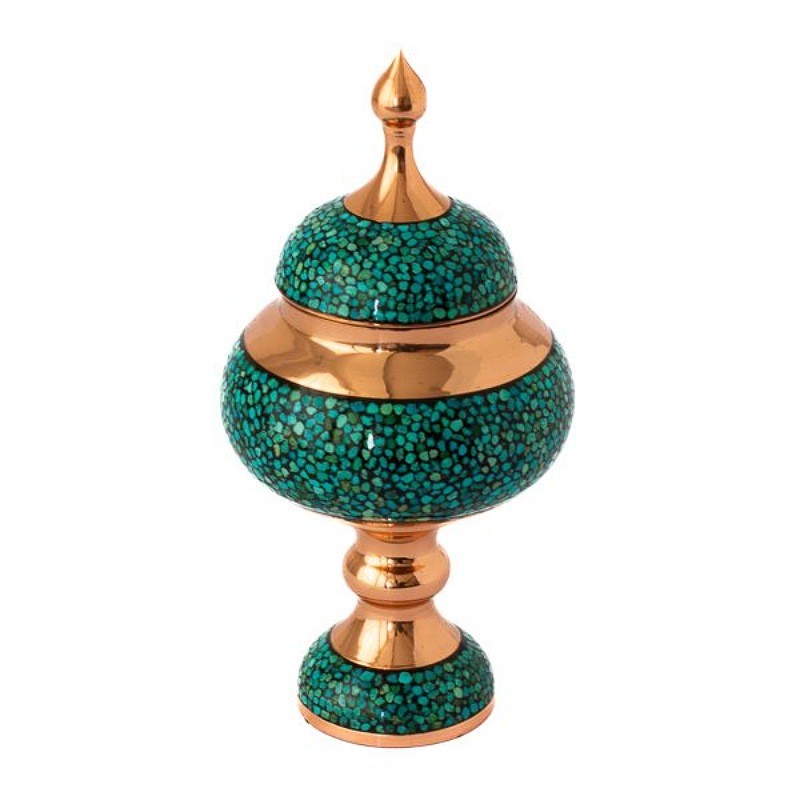 این کار نفیس فیروزه کوبی دارای پوششی از پلی استر است که علاوه بر پوششدهی مناسب سطح مس و جلوگیری از اکسید و سیاه شدن، مقاومت آن را نیز بالا برده است.از آنجاییکه پرداخت نهایی در تولید این کار ماهرانه و با دقت صورت گرفته،سطح مس و فیروزه براق، شفاف و درخشان است. فیروزه کوبی : فیروزه کوبی از صنایع دستی است و با نشاندن قطعه های کوچک سنگ فیروزه به حالت موزاییکی بر سطح ظرف ها ، زیورآلات و اشیای تزئینی ( از پایه هایی به جنس های مسی ، برنجی، نقره، ورشویی ویا برنزی) ساخته می شود . هر چه ظرف فیروزه کوبی شده پر کارتر و منظم تر باشد و فاصله کمتری بین قطعات فیروزه باشد ، ارزش هنری آن بیشتر است . امروزه اصفهان مرکزاین هنر است .