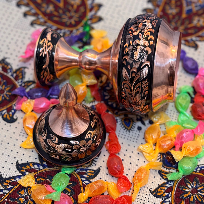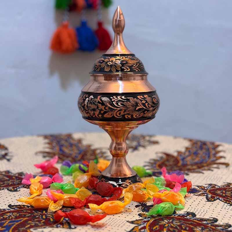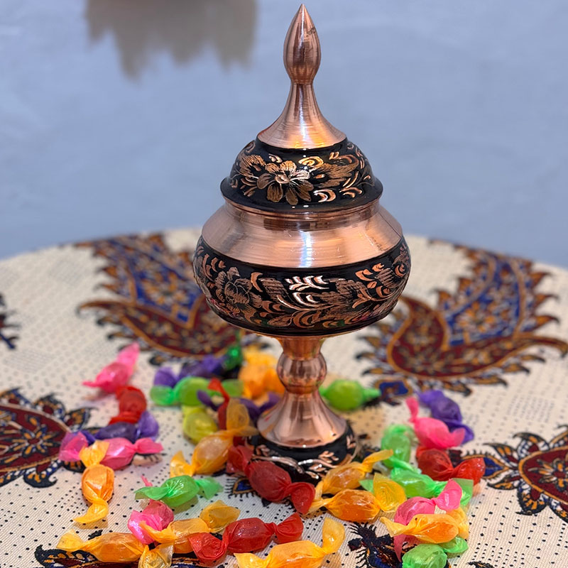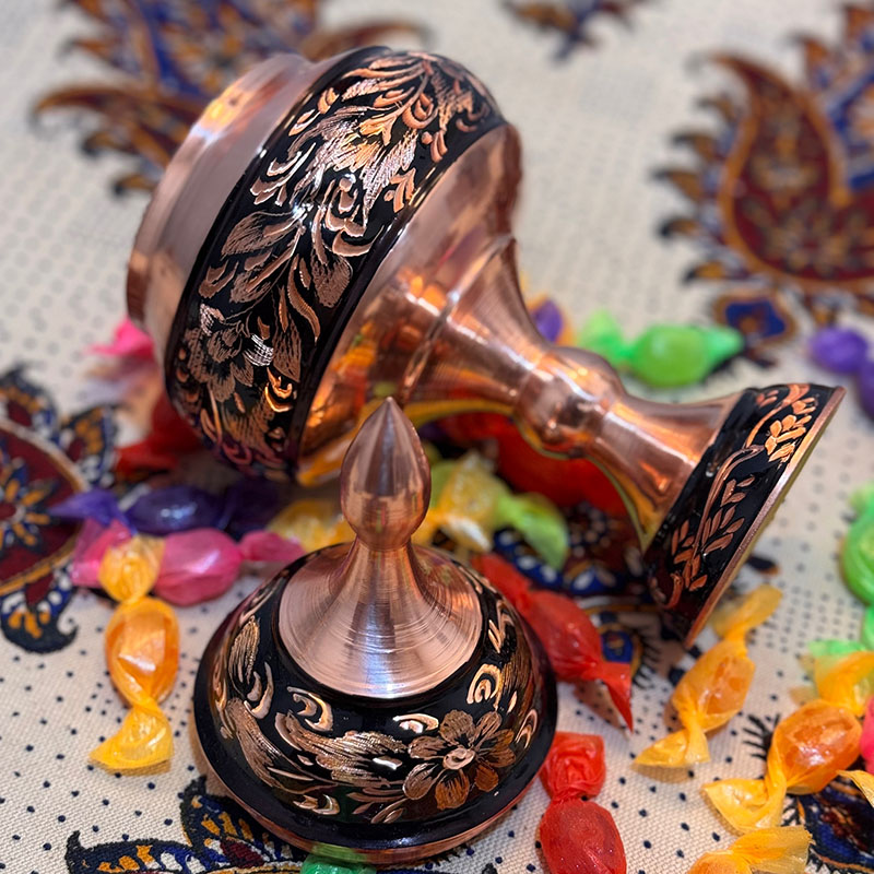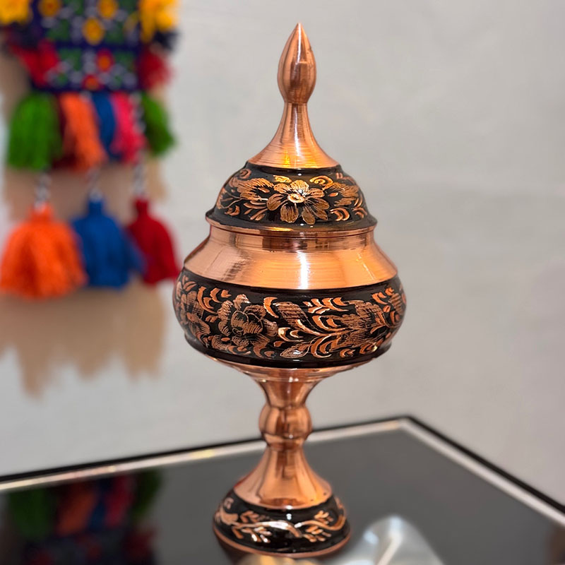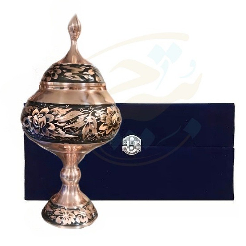 نکته : قیمت این محصول به همراه جعبه مخمل دست ساز درب شیشه ای درج شده است. شکلات خوری مسی الماس تراش طرح گل و مرغ ارتفاع 25 سانتیمتر در سایز های (20،30،35و 40 ) هم موجود است.