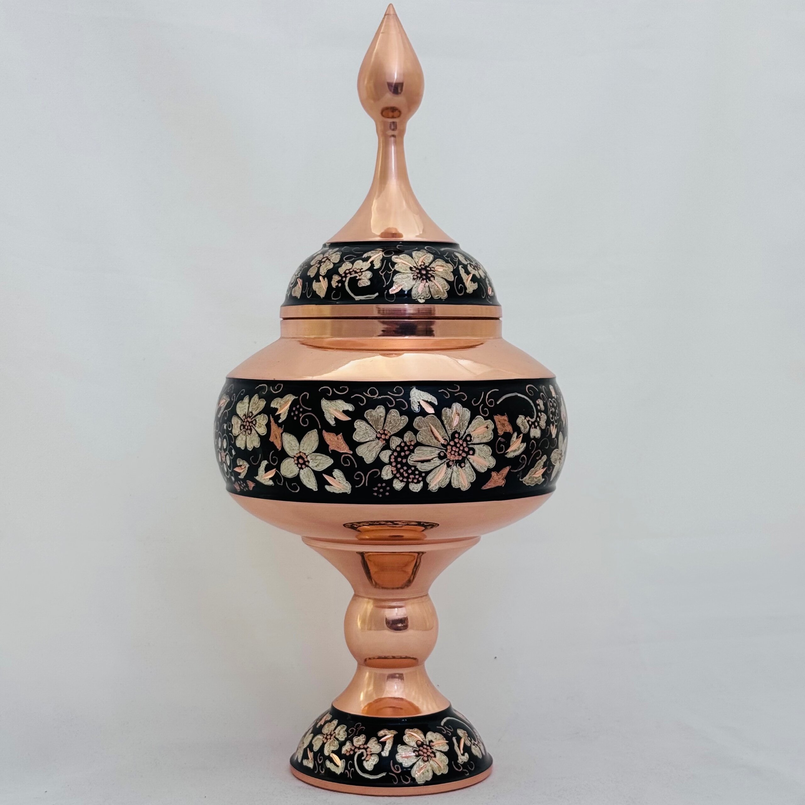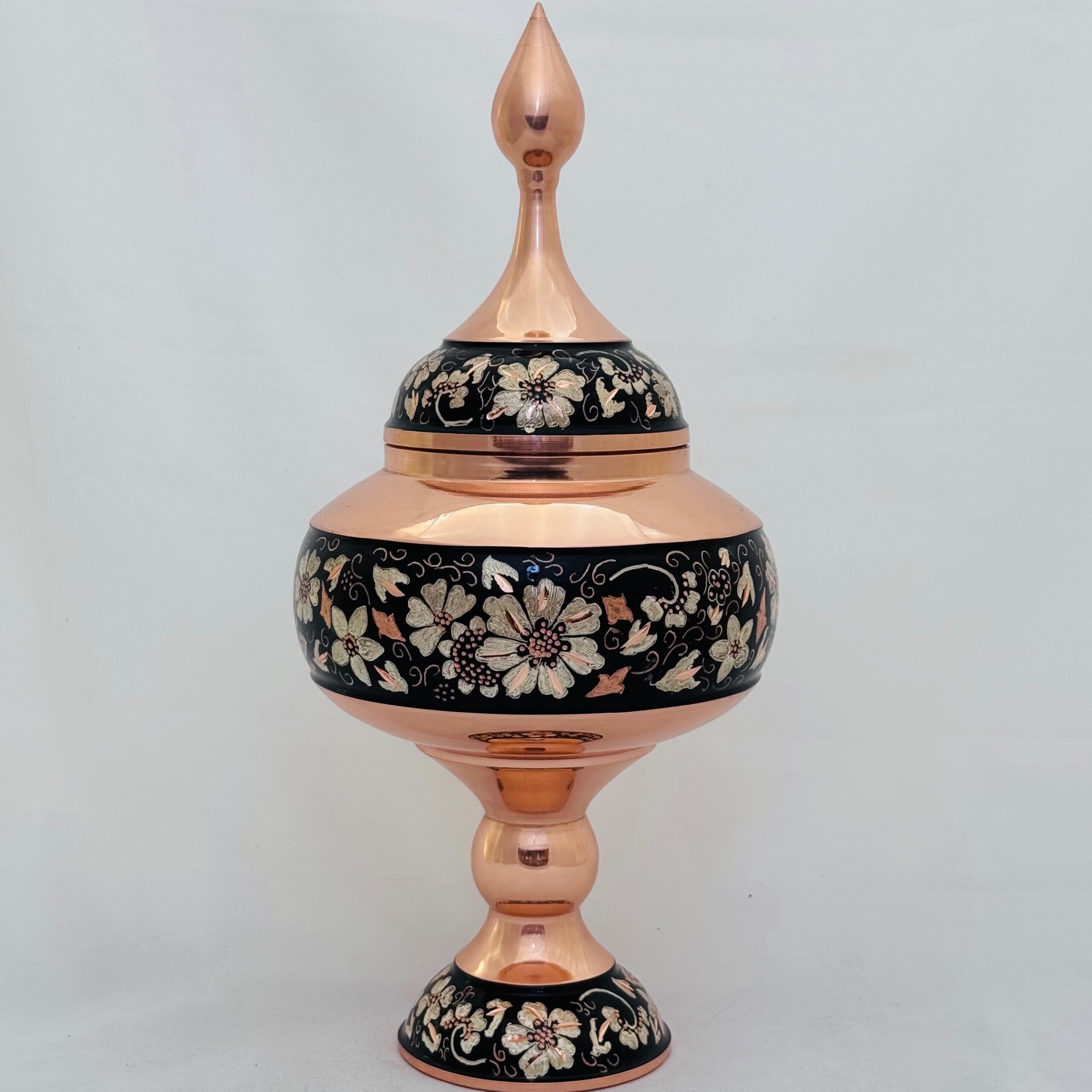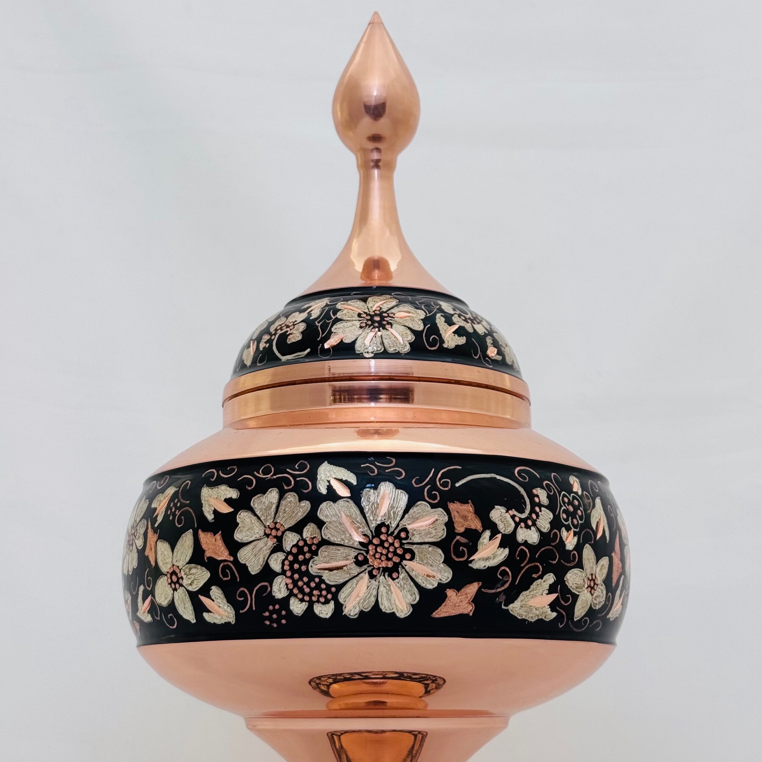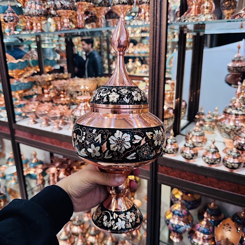جنس محصولات الماس تراش از فلز مس مرغوب است. ابتدا قسمت وسط گلدان با رنگ مخصوص (معمولا رنگ مشکی) نقاشی شده و سپس نقره کوبی میشود و طرح های مورد نظر بصورت ذهنی توسط استادکار ماهر بوجود می آید. پس از عملیات ساب و پلی استر ظروف بسیار زیبایی بدست خواهد آمد که هم براقی و هم ماندگاری فوق العاده ای دارد. طرح های حک شده بر روی ظروف الماس تراش ، برگرفته از هنر اصیل ایرانی بوده که توسط هنرمندان با ذوق اصفهانی بر روی ظروف مسی تراشیده شده است. فلز مس مورد استفاده در محصولات الماس تراش ضخامت بالا و مناسبی دارد و به شکل نهایی محصول جلوه خاصی بخشیده است. شما میتوانید از محصولات الماس تراش برای تهیه انواع هدایای سازمانی و ارگانی بهرمند شوید. امکان ساخت انواع جعبه های شیک و سفارشی وجود دارد. قبل از سفارش طرح مورد نظرتون رو استعلام بگیرید و با اطمینان خرید کنید.
