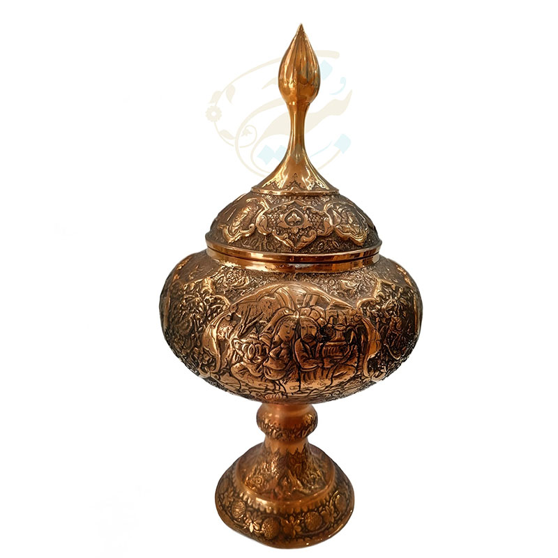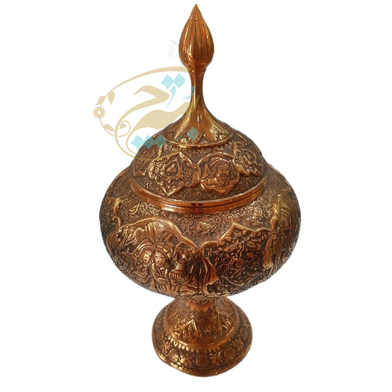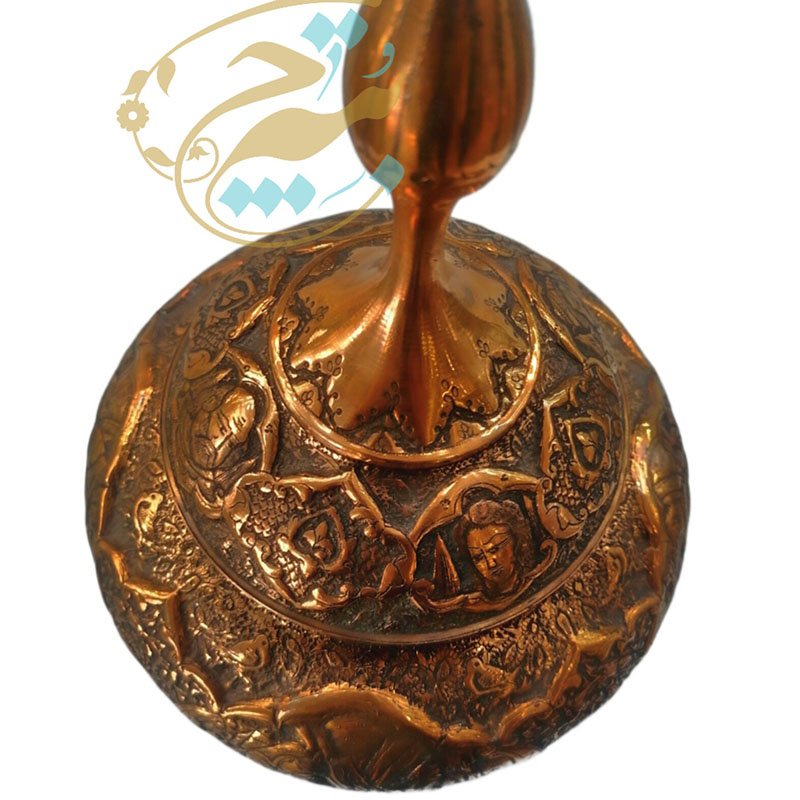 ارتفاع کلی این شکلات خوری زیبا حدود 40 سانتی متر و ابعاد شکمی در بیشترین حالت درحدود 20 و قطر دهنه 14 سانتی متر می باشد.(به خاطر دست ساز بودن تمامی محصولات امکان اختلاف سایز اندکی وجود دارد. ) قلم کار شده بسیار ریز میباشد و دارای اصالت هنری است. (باکارهای بازاری سنجیده نشود.) نقوش گل و مرغ یا چهره که با ظرافت تمام روی سطح این شکلات خوری زیبا اجرا شده‌اند، در کنار رنگ زیبای زمینه و خلاقیت هنرمند سازنده در استفاده از نقوش ایرانی، این شکلات خوری قلمزنی را به اثری خاص و جالب‌توجه تبدیل کرده است. این شکلات خوری با ظاهر زیبایی که دارد، می‌تواند در مهمانی‌ها بسیار به کارتان آید و شما را به میزبانی باسلیقه تبدیل کند. شکلات‌خوری قلم‍زنی مدل پایه‌دار ارتفاع 40 سانتی‌متر را هنرمند ان اصفهانی به نام طراحی و اجرا کرده اند. نقوش روی زمینه‌ای از جنس فلز مس طراحی و با قلم‌های بسیار ظریف ایجاد شده‌اند. ارتفاع ظرف در حدود 40 سانتی‌متر است و به دلیل استفاده از فلز در ساخت، وزن 1500 گرمی آن قابل‌توجیه است. این ظرف اثری دست‌ساز و زیباست که با طرح‌های اصیل و ایرانی خود می‌تواند به خودی خود فضای خانه‌تان را تحت‌تاثیر قرار دهد. قلمزنی هنر اجرای نقوش بر اشیا فلزی است. هنری که در اجرای آن ظرافت، دقت و حوصله از مهم‌ترین ملزومات هستند. نقش گل و مرغ و چهره همچنان به‌عنوان رایج‌ترین نقوش هنر قلمزنی روی بسیاری از آثار فلزی اجرا می‌شود و از محبوب‌ترین طرح‌هاست. شیوه‌ی کار در هنری قلمزنی به این صورت است که ابتدا هنرمند قلمزن طرحی را که باید اجرا شود، با مداد روی سطح فلز ترسیم می‌کند. در مرحله‌ی بعد داخل یا بیرون کار را با قیر مذاب پر می‌کنند و بعد از اینکه قیر سفت شد، با استفاده از چکش و قلم‌، شروع به اجرای طرح می‌کنند. ریختن قیر به منظور کج‌نشدن ظرف یا جلوگیری از شکستن آن بر اثر ضربات چکش و قلم انجام می‌شود. قلم‌ها انواع گوناگون دارند و بر اساس طرح و نحوه‌ی کار به شکل‌های مختلف ساخته می‌شوند. هنرمندان چیره‌دست معمولا قلم‌های‌ مورداستفاده‌شان را بر اساس نوع نیازی که دارند، خودشان می‌سازند. ظروف یا صفحه‌‎های مسطح مسی یا برنجی رایج‌ترین زمینه‌ها برای اجرای هنر قلمزنی هستند و گاهی با لعابی از قلع پوشانده می‌شوند. لطفاً قبل از سفارش طرح قندان مسی مورد نظرتون رو انتخاب کنید در غیر اینصورت یکی از قندان های زیبای تقریبا مشابه به صورت رندوم برای شما مونتاژ و ارسال می شود. پس از دریافت محصول، حتما در حضور مامور پست آن را چک کنید، در غیر اینصورت هرگونه آسیب فیزیکی به محصول برعهده فروشگاه نمی باشد.