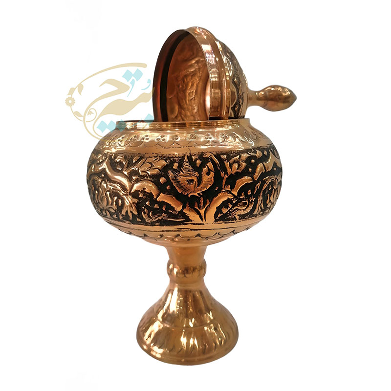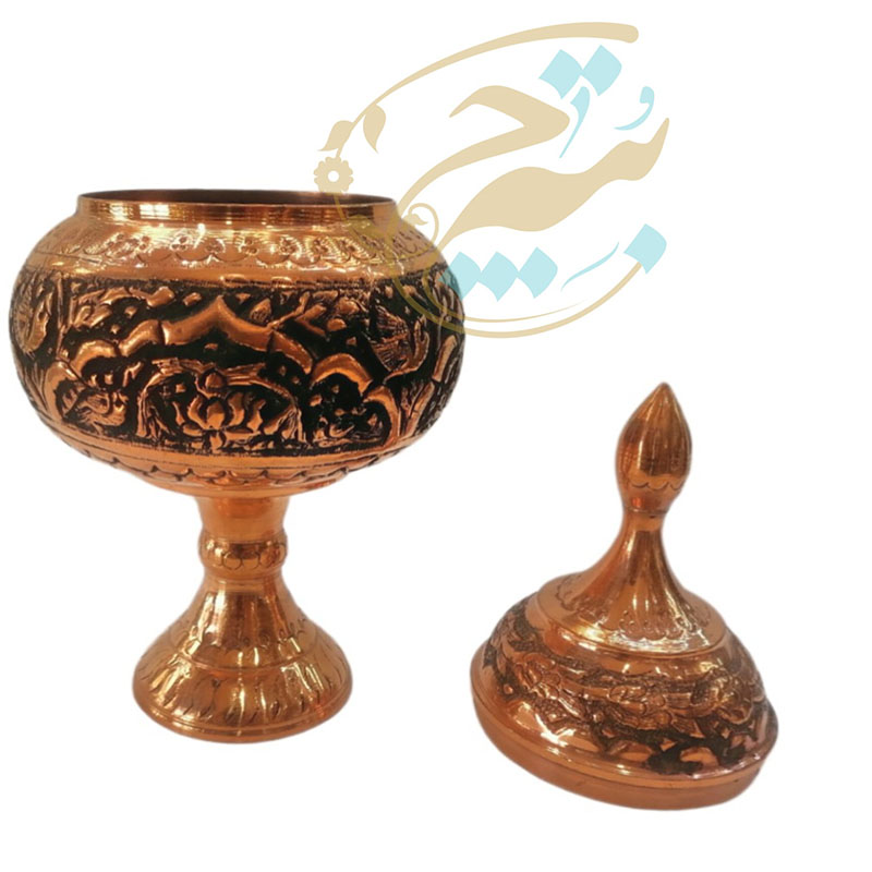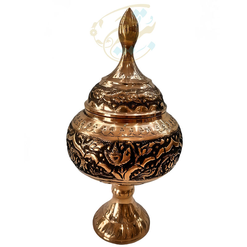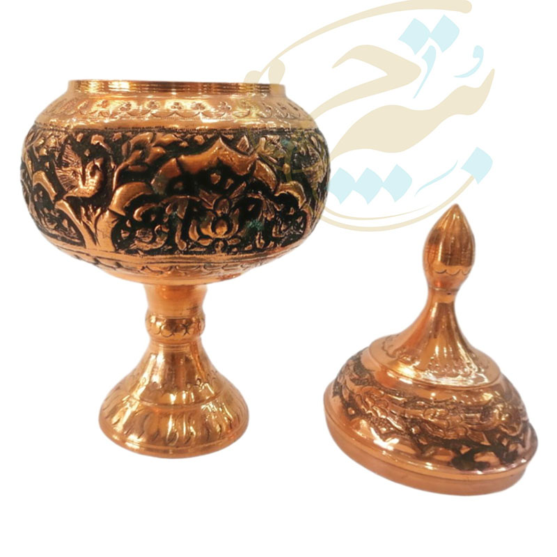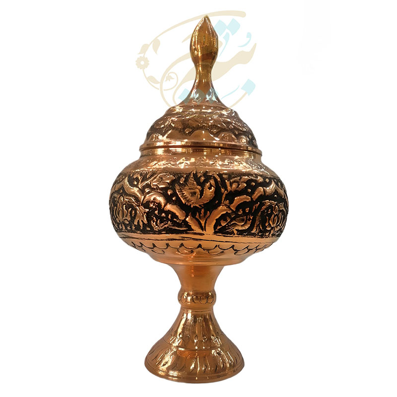 ارتفاع کلی این شکلات خوری زیبا حدود 26 سانتی متر و ابعاد شکمی در بیشترین حالت حدود 13 سانتی متر و قطر دهنه 9 سانتی متر می باشد.(به خاطر دست ساز بودن تمامی محصولات امکان اختلاف سایز اندکی وجود دارد. ) قلم کار شده بسیار ریز میباشد و دارای اصالت هنری است. (باکارهای بازاری سنجیده نشود.) نقوش گل و مرغ یا چهره که با ظرافت تمام روی سطح این شکلات خوری زیبا اجرا شده‌اند، در کنار رنگ زیبای زمینه و خلاقیت هنرمند سازنده در استفاده از نقوش ایرانی، این شکلات خوری قلمزنی را به اثری خاص و جالب‌توجه تبدیل کرده است. این شکلات خوری با ظاهر زیبایی که دارد، می‌تواند در مهمانی‌ها بسیار به کارتان آید و شما را به میزبانی باسلیقه تبدیل کند. شکلات‌خوری قلم‍زنی مدل پایه‌دار ارتفاع 20 سانتی‌متر را هنرمند ان اصفهانی به نام طراحی و اجرا کرده اند. نقوش روی زمینه‌ای از جنس فلز مس طراحی و با قلم‌های بسیار ظریف ایجاد شده‌اند. ارتفاع ظرف در حدود 20تا22 سانتی‌متر است و به دلیل استفاده از فلز در ساخت، وزن 200-300 گرمی آن قابل‌توجیه است. این ظرف اثری دست‌ساز و زیباست که با طرح‌های اصیل و ایرانی خود می‌تواند به خودی خود فضای خانه‌تان را تحت‌تاثیر قرار دهد. قلمزنی هنر اجرای نقوش بر اشیا فلزی است. هنری که در اجرای آن ظرافت، دقت و حوصله از مهم‌ترین ملزومات هستند. نقش گل و مرغ و چهره همچنان به‌عنوان رایج‌ترین نقوش هنر قلمزنی روی بسیاری از آثار فلزی اجرا می‌شود و از محبوب‌ترین طرح‌هاست. شیوه‌ی کار در هنری قلمزنی به این صورت است که ابتدا هنرمند قلمزن طرحی را که باید اجرا شود، با مداد روی سطح فلز ترسیم می‌کند. در مرحله‌ی بعد داخل یا بیرون کار را با قیر مذاب پر می‌کنند و بعد از اینکه قیر سفت شد، با استفاده از چکش و قلم‌، شروع به اجرای طرح می‌کنند. ریختن قیر به منظور کج‌نشدن ظرف یا جلوگیری از شکستن آن بر اثر ضربات چکش و قلم انجام می‌شود. قلم‌ها انواع گوناگون دارند و بر اساس طرح و نحوه‌ی کار به شکل‌های مختلف ساخته می‌شوند. هنرمندان چیره‌دست معمولا قلم‌های‌ مورداستفاده‌شان را بر اساس نوع نیازی که دارند، خودشان می‌سازند. ظروف یا صفحه‌‎های مسطح مسی یا برنجی رایج‌ترین زمینه‌ها برای اجرای هنر قلمزنی هستند و گاهی با لعابی از قلع پوشانده می‌شوند. لطفاً قبل از سفارش طرح قندان مسی مورد نظرتون رو انتخاب کنید در غیر اینصورت یکی از قندان های زیبای تقریبا مشابه به صورت رندوم برای شما مونتاژ و ارسال می شود. پس از دریافت محصول، حتما در حضور مامور پست آن را چک کنید، در غیر اینصورت هرگونه آسیب فیزیکی به محصول برعهده فروشگاه نمی باشد.