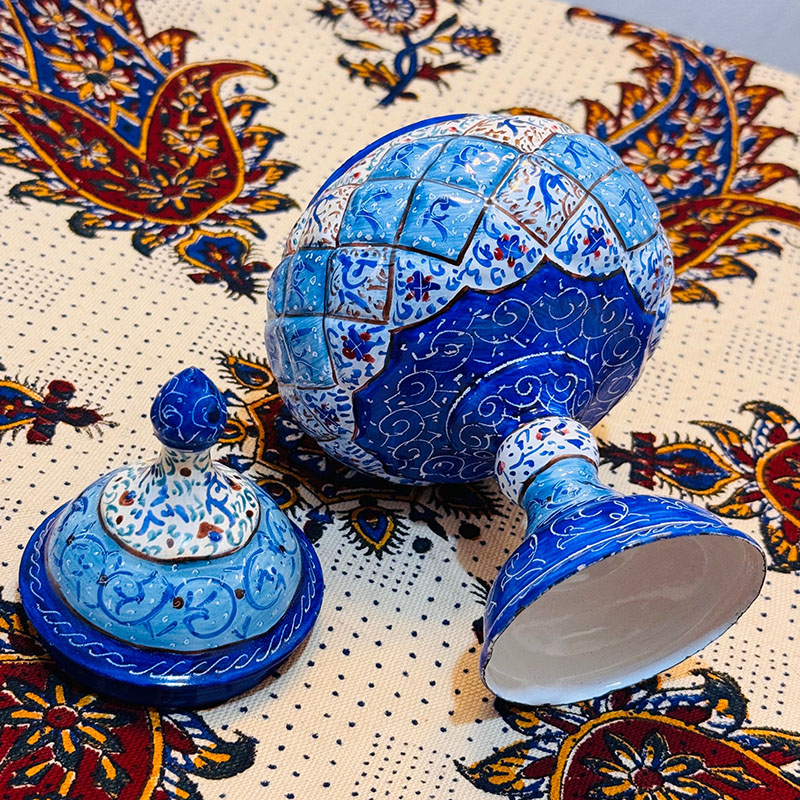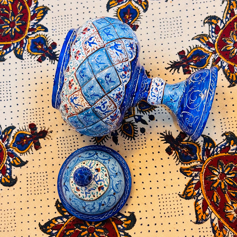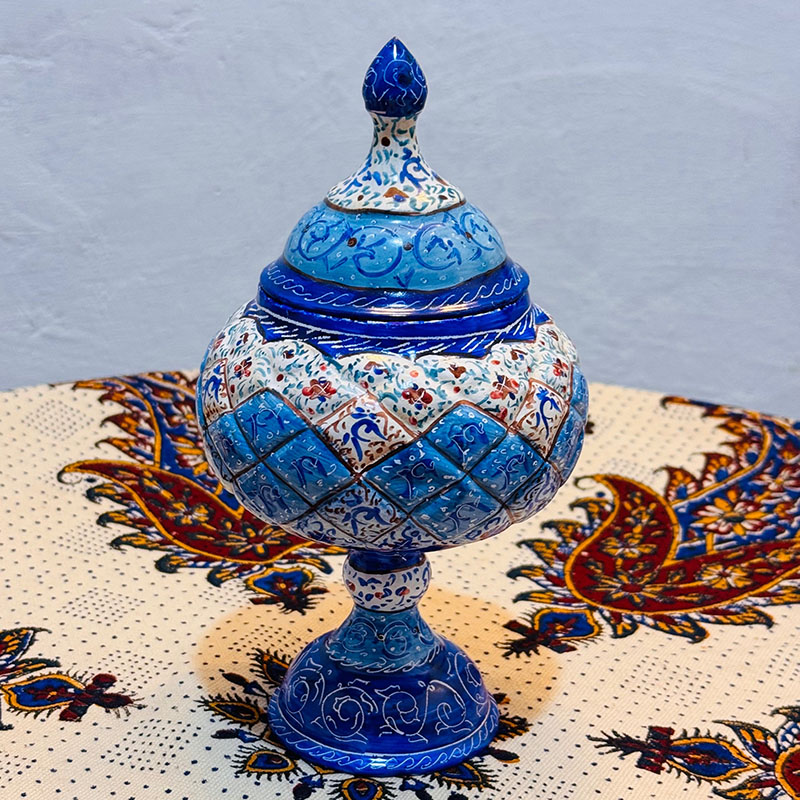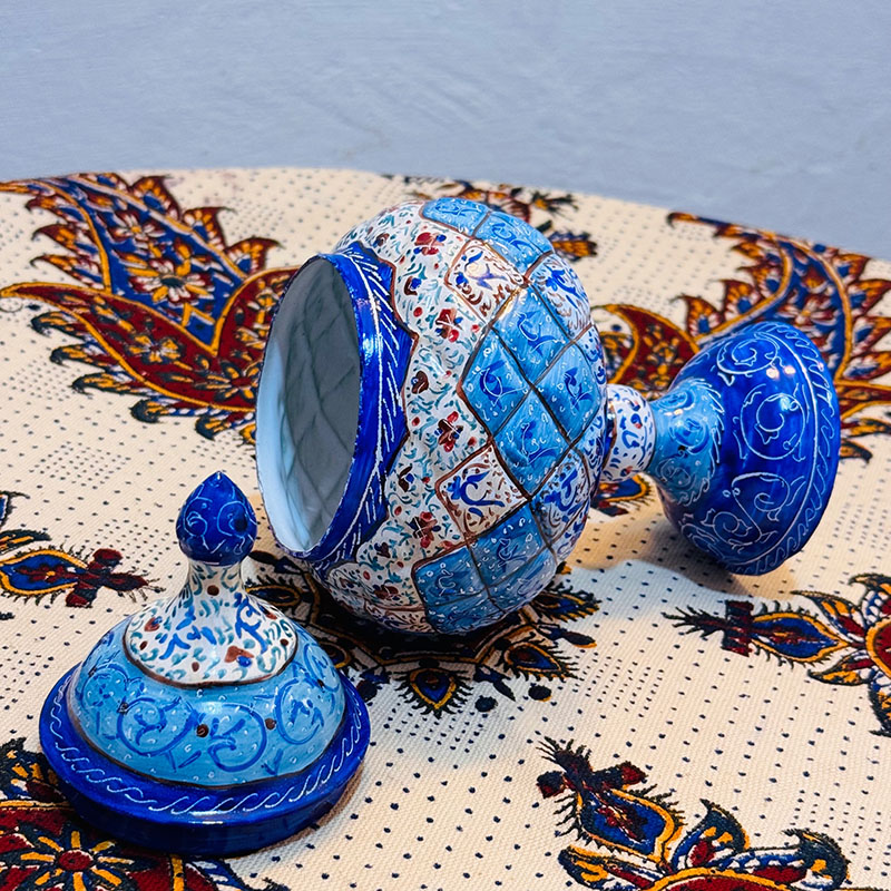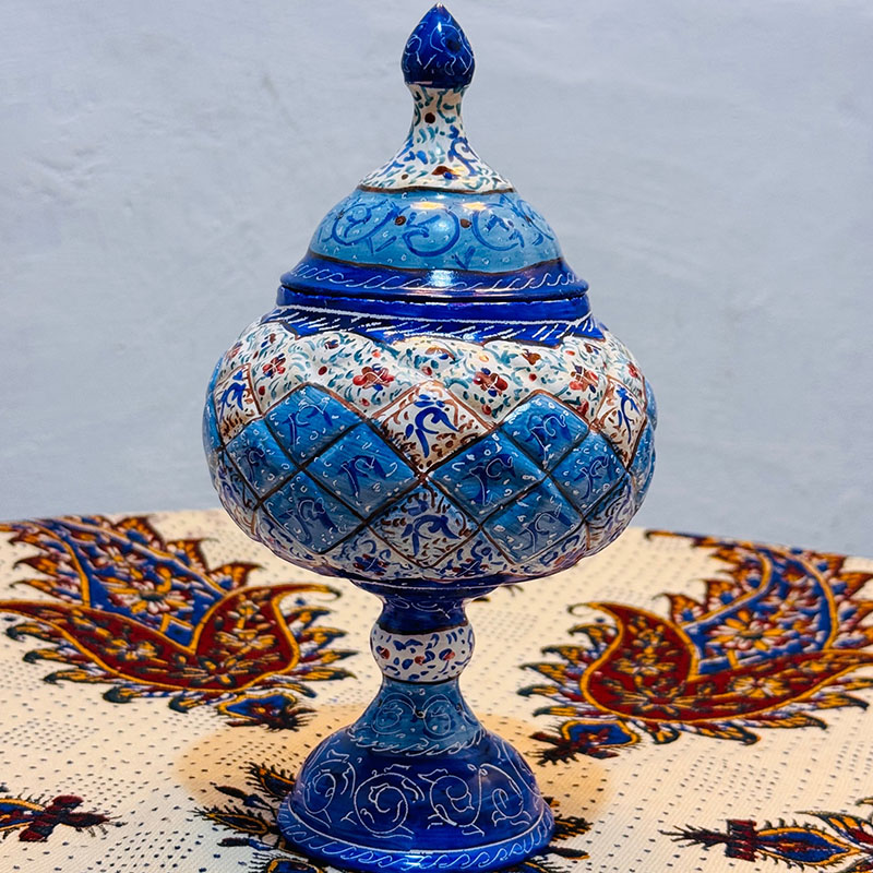 شکلات خوری پایه دار شکیل و زیبای مینا کاری شده یکی دیگر از آثار نفیس هنر مینا کاری می باشد همانطور که می دانید مینا کاری بر روی ظروف فلزی با طرح ها و رنگ های بسیار زیبا با پس زمینه آبی لاجوردی انجام می گیرد . این شکلات خوری نفیس ، تمام کار دست هنرمندان اصفهانی می باشد که ساعت های زیادی با انجام کارهای بسیار ظریف و زیبایی این ظروف هنری را می سازند . مینا کاری یکی از آثار بسیار مهم صنایع دستی در شهر اصفهان است که در تمام ایران طرفداران زیادی دارد . شکلات خوری مینا کاری شده ارتفاع 20 سانتی متری دارد . دارای یک پایه بسیار شیک است که زیبایی آن را دو چندان کرده است . درب این قندان با طرح مینا کاری نقاشی شده است که به راحتی باز و بسته می شود . از این ظرف زیبا برای سرو انواع خوراکی مانند شکلات ، شیرینی ، گز، انواع آجیل و … استفاده می کنند