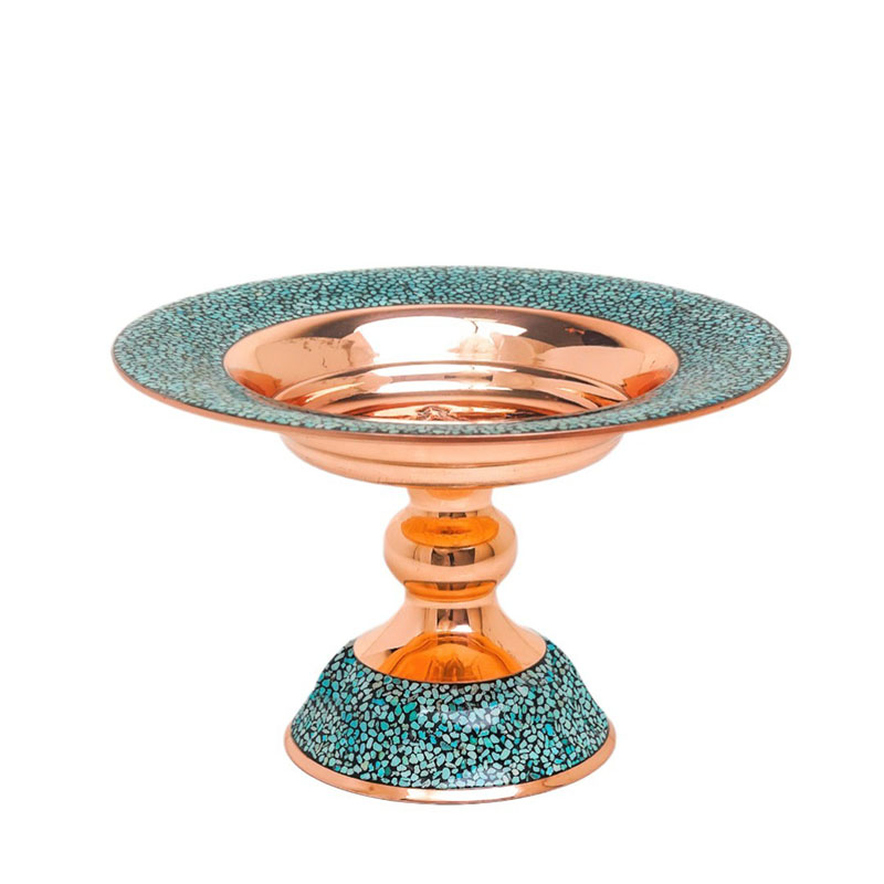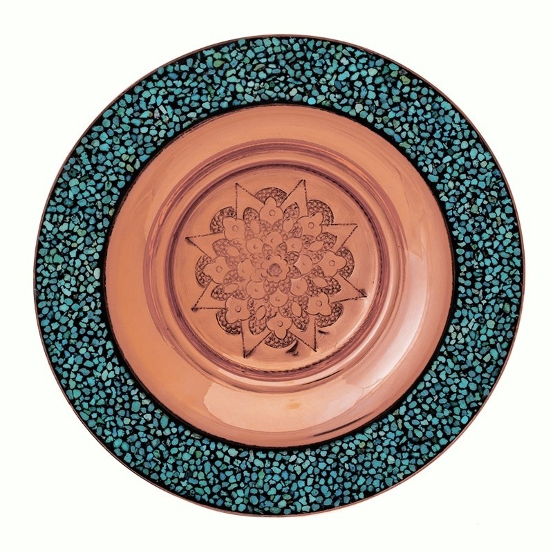 این کار نفیس فیروزه کوبی دارای پوششی از پلی استر است که علاوه بر پوششدهی مناسب سطح مس و جلوگیری از اکسید و سیاه شدن، مقاومت آن را نیز بالا برده است.از آنجاییکه پرداخت نهایی در تولید این کار ماهرانه و با دقت صورت گرفته،سطح مس و فیروزه براق، شفاف و درخشان است. فیروزه کوبی : فیروزه کوبی از صنایع دستی است و با نشاندن قطعه های کوچک سنگ فیروزه به حالت موزاییکی بر سطح ظرف ها ، زیورآلات و اشیای تزئینی ( از پایه هایی به جنس های مسی ، برنجی، نقره، ورشویی ویا برنزی) ساخته می شود . هر چه ظرف فیروزه کوبی شده پر کارتر و منظم تر باشد و فاصله کمتری بین قطعات فیروزه باشد ، ارزش هنری آن بیشتر است . امروزه اصفهان مرکزاین هنر است .