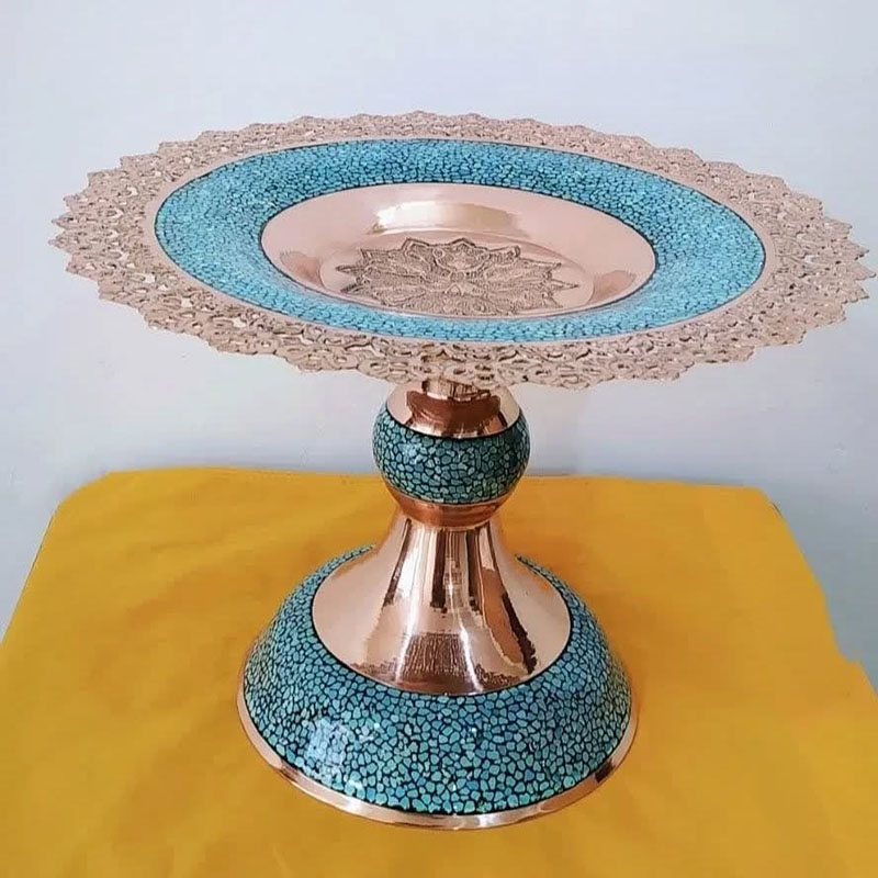 این کار نفیس فیروزه کوبی دارای پوششی از پلی استر است که علاوه بر پوششدهی مناسب سطح مس و جلوگیری از اکسید و سیاه شدن، مقاومت آن را نیز بالا برده است.از آنجاییکه پرداخت نهایی در تولید این کار ماهرانه و با دقت صورت گرفته،سطح مس و فیروزه براق، شفاف و درخشان است. فیروزه کوبی : فیروزه کوبی از صنایع دستی است و با نشاندن قطعه های کوچک سنگ فیروزه به حالت موزاییکی بر سطح ظرف ها ، زیورآلات و اشیای تزئینی ( از پایه هایی به جنس های مسی ، برنجی، نقره، ورشویی ویا برنزی) ساخته می شود . هر چه ظرف فیروزه کوبی شده پر کارتر و منظم تر باشد و فاصله کمتری بین قطعات فیروزه باشد ، ارزش هنری آن بیشتر است . امروزه اصفهان مرکزاین هنر است .