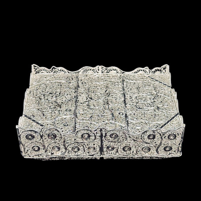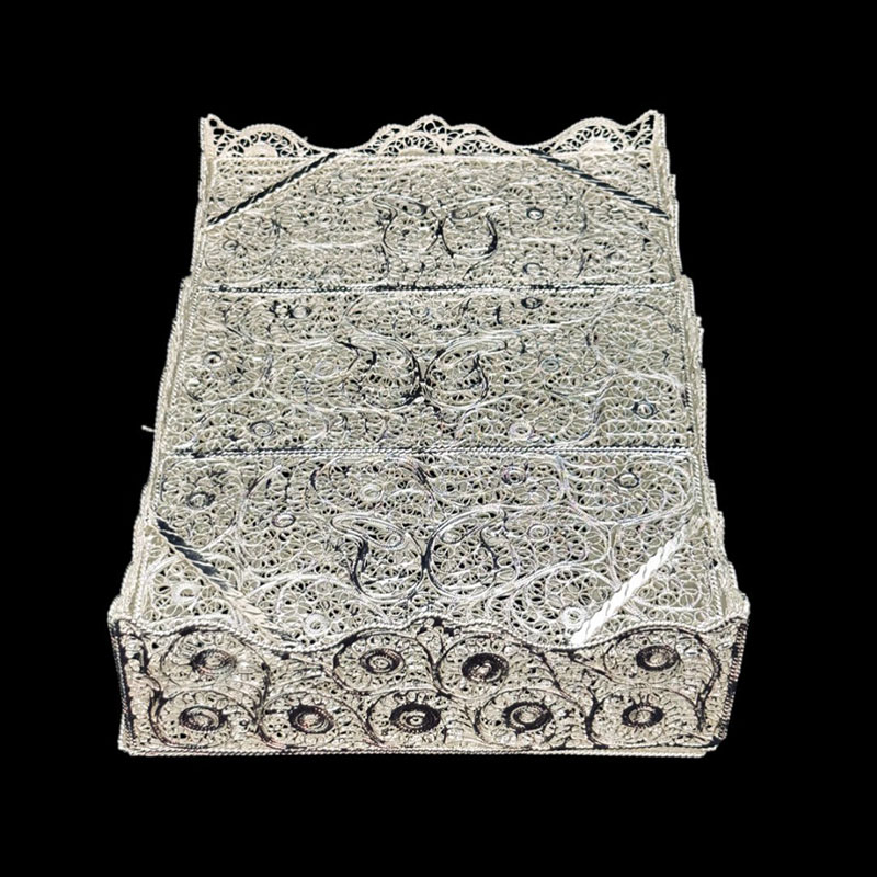 ملیله‌کاری، هنر ظریف و زیبای ساخت اشیاء تزئینی از مفتول‌های نازک مس با روکش نقره است که ریشه در تاریخ و فرهنگ اصفهان دارد. محصولات ملیله‌کاری با طرح‌های پیچیده و چشم‌نواز، جلوه‌ای خاص به دکوراسیون منزل می‌بخشند و می‌توانند به عنوان هدیه‌ای ارزشمند مورد استفاده قرار گیرند. کیفیت ملیله‌کاری تولیدی بُته چی به دلیل استفاده از مواد اولیه مرغوب و دقت بالای هنرمندان، از کیفیت بالایی برخوردار است و می‌تواند سال‌ها زیبایی خود را حفظ کند. ساخت ظروف ملیله‌کاری نیاز به مهارت و دقت بالایی دارد. در ابتدا، فلز مورد استفاده برای ساخت ظروف ملیله کاری به رشته‌های نازک و بسیار دقیق تبدیل می‌شود. سپس این رشته‌ها با دستان هنرمند به اشکال پیچیده و ظریف بافته می‌شوند. این رشته‌های فلزی پس از بافتن، به شکل یک ظرف با جزئیات دقیق و ظریف درمی‌آیند که اغلب با الگوهای گل و گیاه یا طرح‌های هندسی زینت داده می‌شوند. برای تکمیل کار، معمولاً این ظروف با استفاده از سنگ‌های قیمتی یا جواهرات دیگر تزئین می‌شوند تا جلوه‌ای خاص و نفیس پیدا کنند. با خرید ظروف ملیله کاری اصفهان، شما نه تنها یک شیء زیبا و دکوری را به خانه خود اضافه می‌کنید، بلکه از هنر و هنرمندان ایرانی نیز حمایت می‌کنید. به علت دست ساز بودن تمامی محصولات امکان اختلاف سایز اندکی وجود دارد.