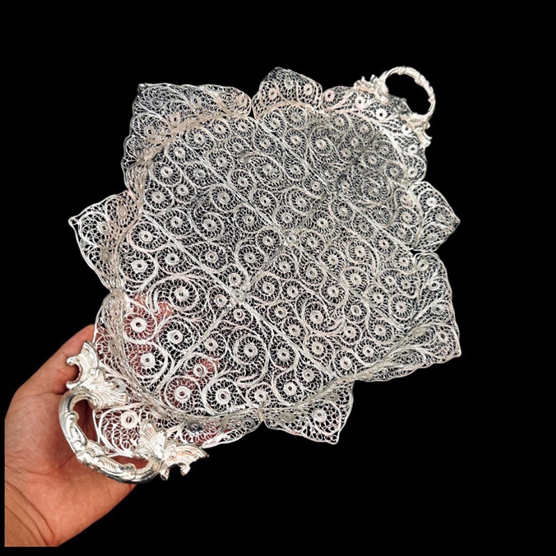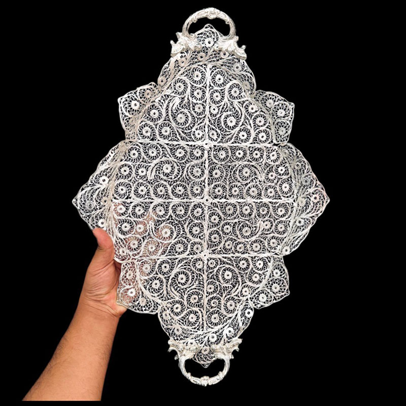 ملیله‌کاری، هنر ظریف و زیبای ساخت اشیاء تزئینی از مفتول‌های نازک مس با روکش نقره است که ریشه در تاریخ و فرهنگ اصفهان دارد. محصولات ملیله‌کاری با طرح‌های پیچیده و چشم‌نواز، جلوه‌ای خاص به دکوراسیون منزل می‌بخشند و می‌توانند به عنوان هدیه‌ای ارزشمند مورد استفاده قرار گیرند. کیفیت ملیله‌کاری تولیدی بُته چی به دلیل استفاده از مواد اولیه مرغوب و دقت بالای هنرمندان، از کیفیت بالایی برخوردار است و می‌تواند سال‌ها زیبایی خود را حفظ کند. ساخت ظروف ملیله‌کاری نیاز به مهارت و دقت بالایی دارد. در ابتدا، فلز مورد استفاده برای ساخت ظروف ملیله کاری به رشته‌های نازک و بسیار دقیق تبدیل می‌شود. سپس این رشته‌ها با دستان هنرمند به اشکال پیچیده و ظریف بافته می‌شوند. این رشته‌های فلزی پس از بافتن، به شکل یک ظرف با جزئیات دقیق و ظریف درمی‌آیند که اغلب با الگوهای گل و گیاه یا طرح‌های هندسی زینت داده می‌شوند. برای تکمیل کار، معمولاً این ظروف با استفاده از سنگ‌های قیمتی یا جواهرات دیگر تزئین می‌شوند تا جلوه‌ای خاص و نفیس پیدا کنند. با خرید ظروف ملیله کاری اصفهان، شما نه تنها یک شیء زیبا و دکوری را به خانه خود اضافه می‌کنید، بلکه از هنر و هنرمندان ایرانی نیز حمایت می‌کنید. به علت دست ساز بودن تمامی محصولات امکان اختلاف سایز اندکی وجود دارد.