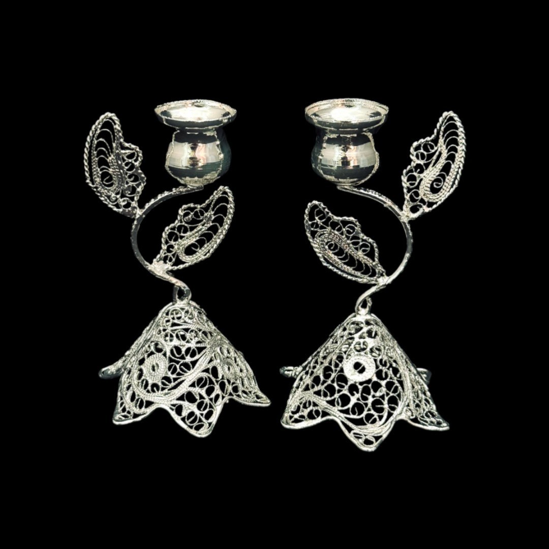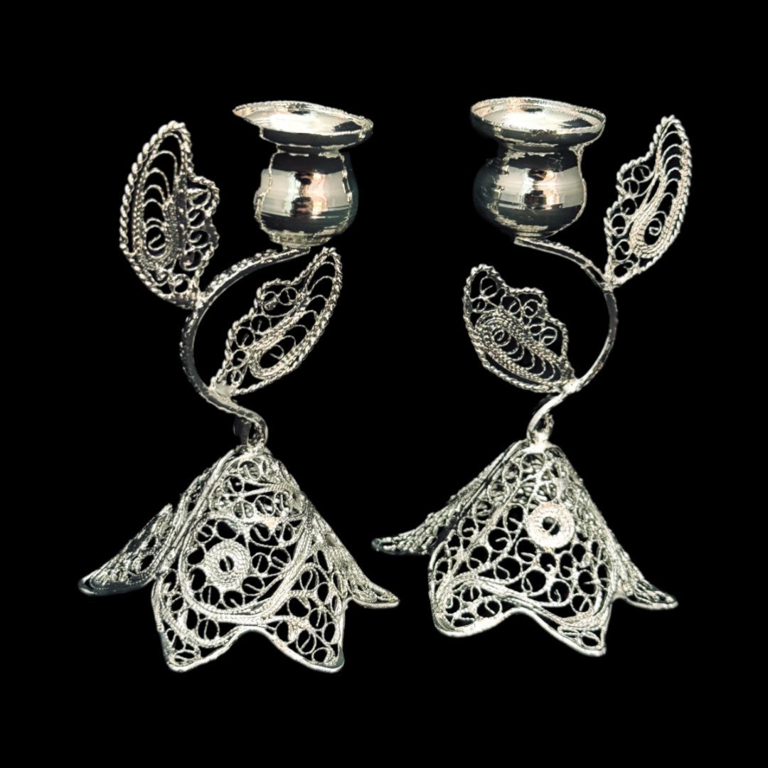 ظروف ملیله کاری شمعدان اشکی کوچک جفتی – ملیلهکاری اصفهان، اثری دستساز از هنرمندان اصفهانی با ظرافت بالای ملیلهکاری، مناسب برای دکوراسیون لوکس و هدیهای ماندگار.
