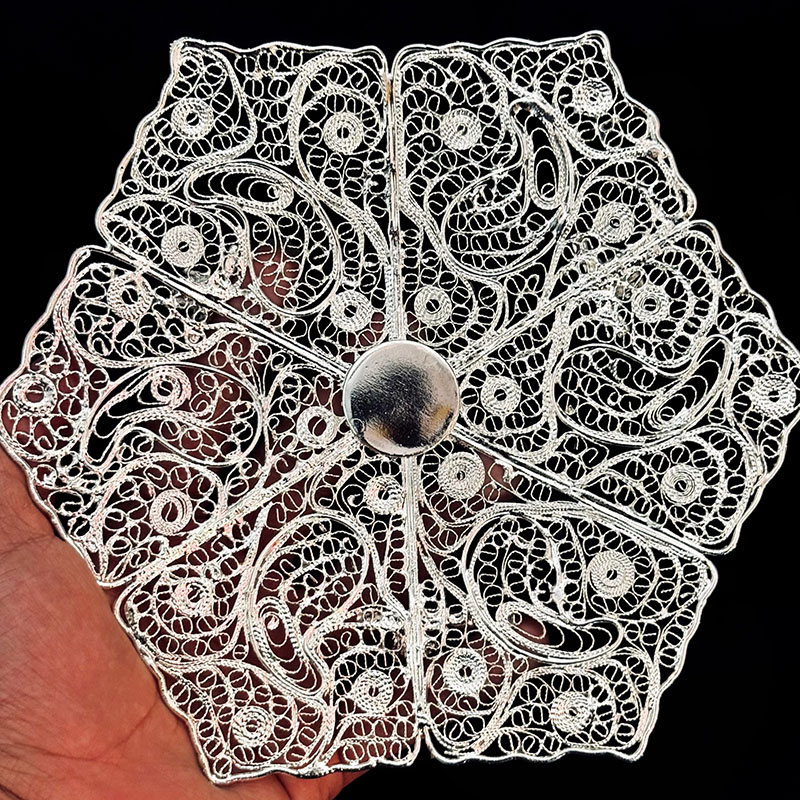 ملیله‌کاری، هنر ظریف و زیبای ساخت اشیاء تزئینی از مفتول‌های نازک مس با روکش نقره است که ریشه در تاریخ و فرهنگ اصفهان دارد. محصولات ملیله‌کاری با طرح‌های پیچیده و چشم‌نواز، جلوه‌ای خاص به دکوراسیون منزل می‌بخشند و می‌توانند به عنوان هدیه‌ای ارزشمند مورد استفاده قرار گیرند. کیفیت ملیله‌کاری تولیدی بُته چی به دلیل استفاده از مواد اولیه مرغوب و دقت بالای هنرمندان، از کیفیت بالایی برخوردار است و می‌تواند سال‌ها زیبایی خود را حفظ کند. ساخت ظروف ملیله‌کاری نیاز به مهارت و دقت بالایی دارد. در ابتدا، فلز مورد استفاده برای ساخت ظروف ملیله کاری به رشته‌های نازک و بسیار دقیق تبدیل می‌شود. سپس این رشته‌ها با دستان هنرمند به اشکال پیچیده و ظریف بافته می‌شوند. این رشته‌های فلزی پس از بافتن، به شکل یک ظرف با جزئیات دقیق و ظریف درمی‌آیند که اغلب با الگوهای گل و گیاه یا طرح‌های هندسی زینت داده می‌شوند. برای تکمیل کار، معمولاً این ظروف با استفاده از سنگ‌های قیمتی یا جواهرات دیگر تزئین می‌شوند تا جلوه‌ای خاص و نفیس پیدا کنند. با خرید ظروف ملیله کاری اصفهان، شما نه تنها یک شیء زیبا و دکوری را به خانه خود اضافه می‌کنید، بلکه از هنر و هنرمندان ایرانی نیز حمایت می‌کنید. به علت دست ساز بودن تمامی محصولات امکان اختلاف سایز اندکی وجود دارد.