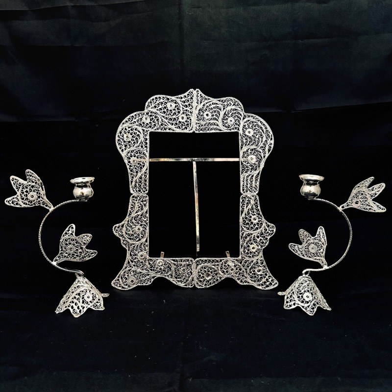 ظروف ملیله کاری قاب آینه مستطیل و شمعدان اشکی بزرگ