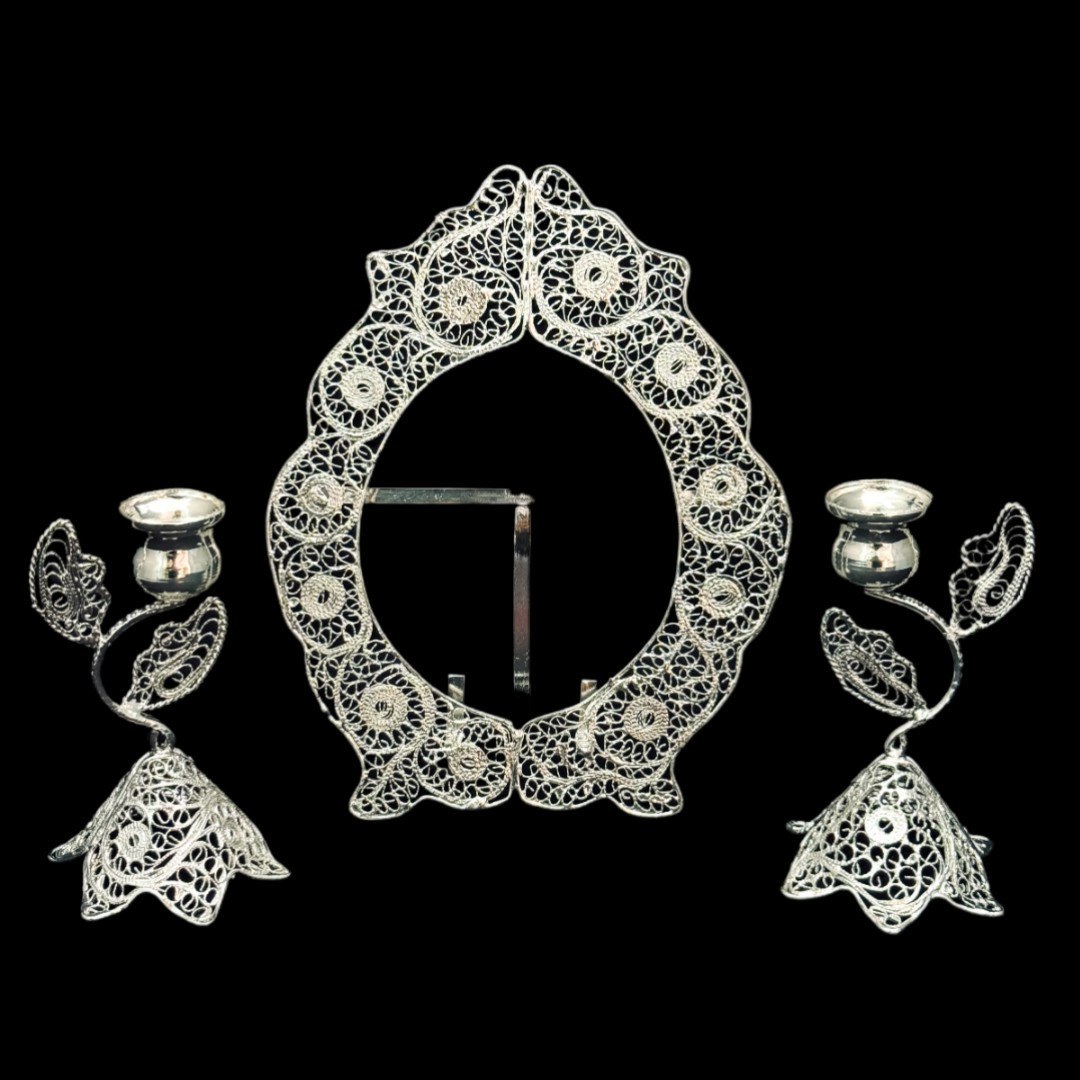خانه / صنایع فلزی / ملیله کاری / انواع ست ملیله کاری / ظروف ملیله کاری قاب آینه و شمعدان اشکی کوچک