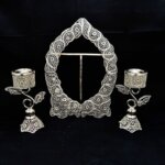 ظروف ملیله کاری قاب آینه و شمعدان طرح اس – ملیلهکاری اصفهان، اثری دستساز از هنرمندان اصفهانی با ظرافت بالای ملیلهکاری، مناسب برای دکوراسیون لوکس و هدیهای ماندگار.