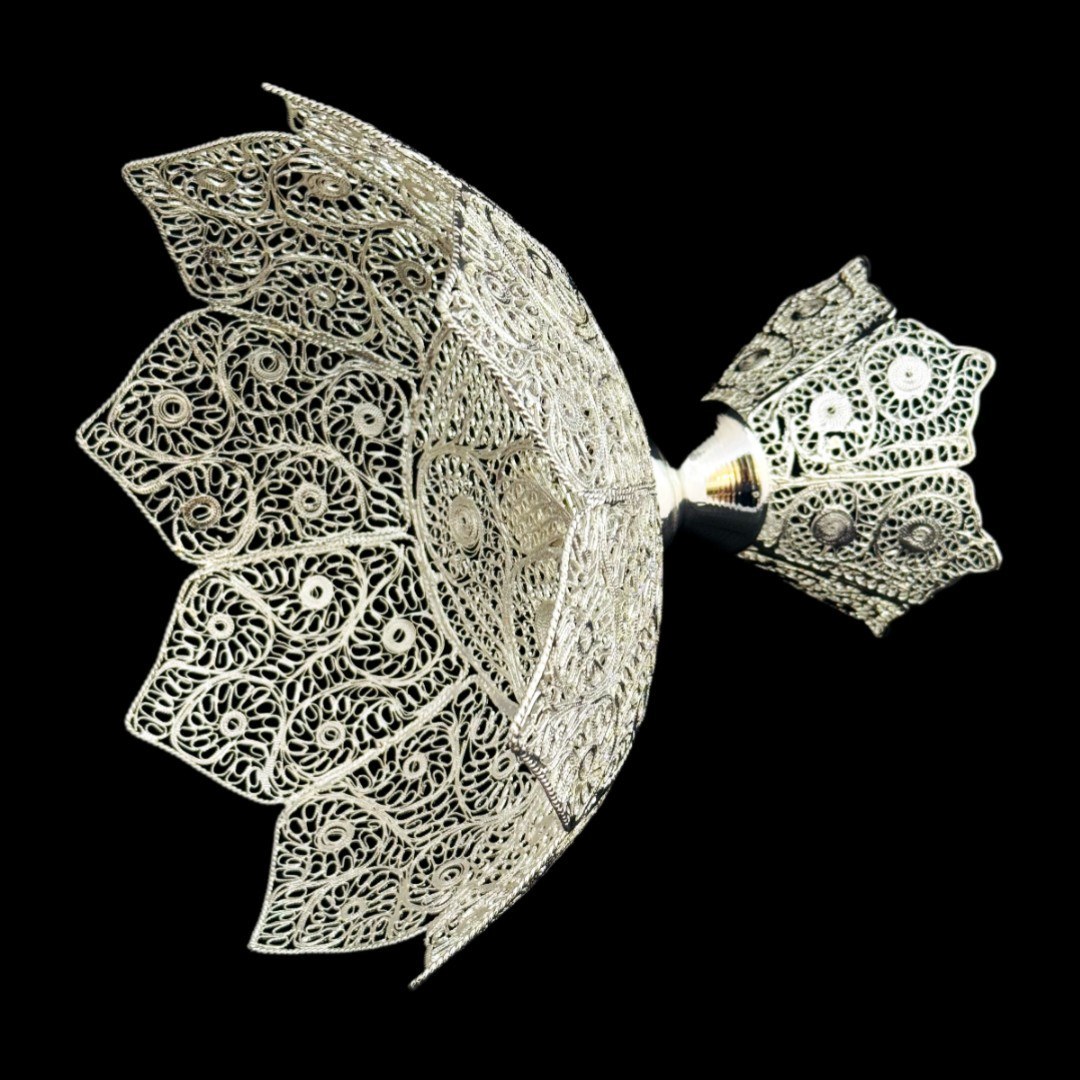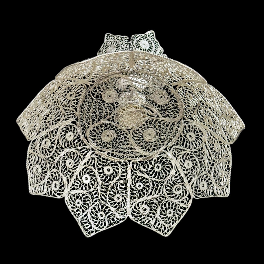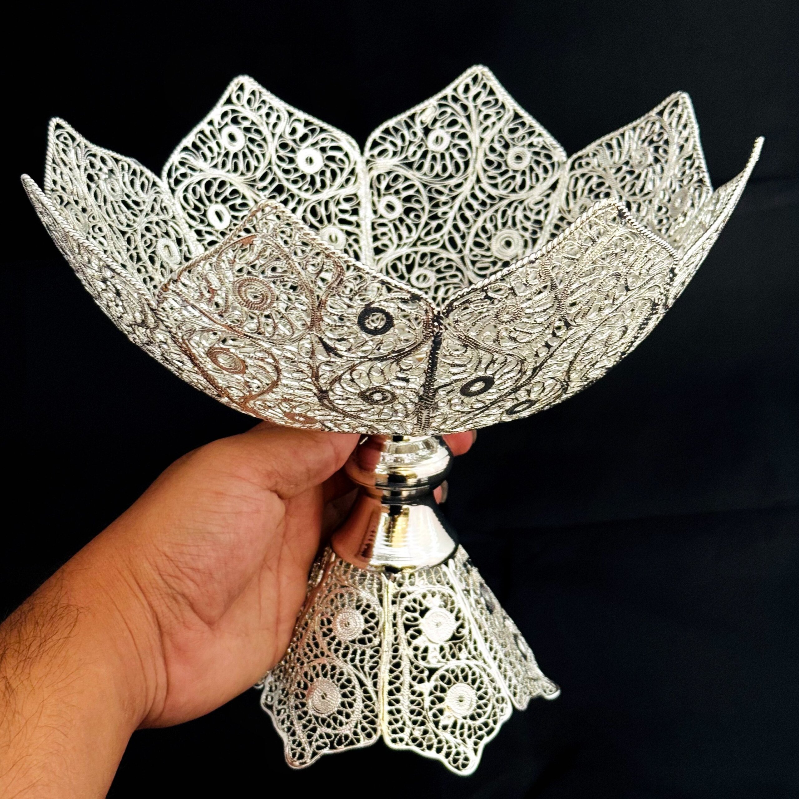 ظروف ملیله کاری کاسه تاجی میوه خوری – ملیلهکاری اصفهان، اثری دستساز از هنرمندان اصفهانی با ظرافت بالای ملیلهکاری، مناسب برای دکوراسیون لوکس و هدیهای ماندگار.