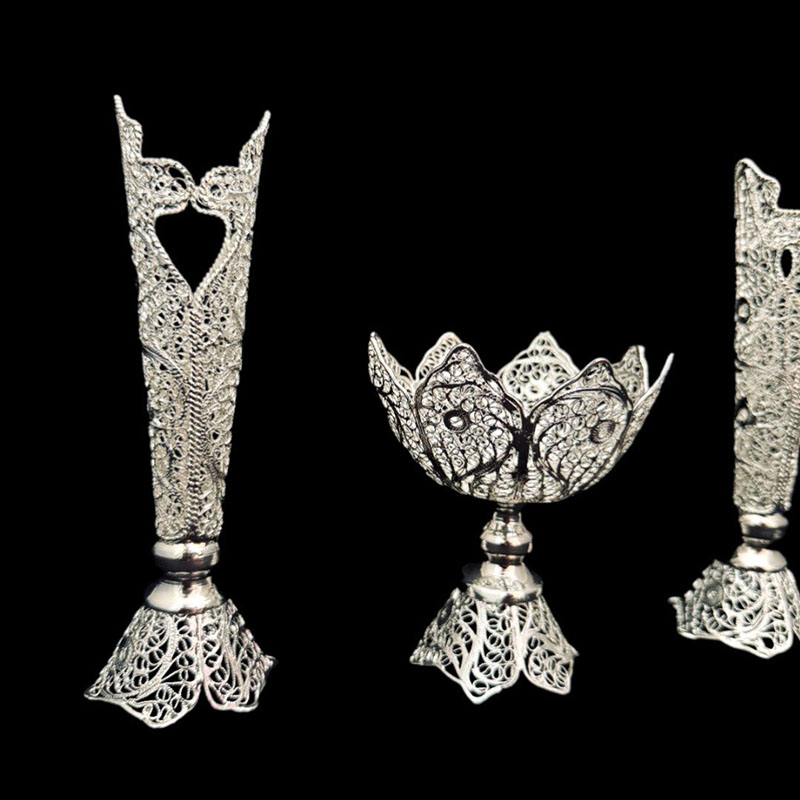 ست هدیه نقره گلدان ملیله کاری و قندان تاجی