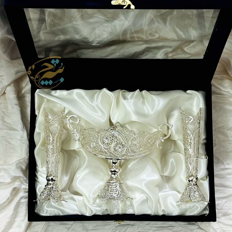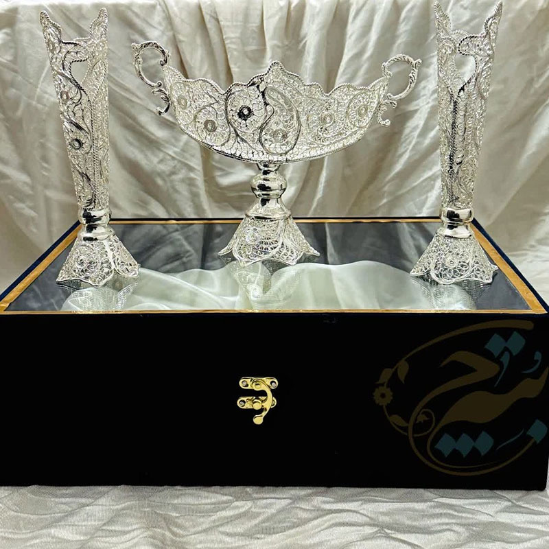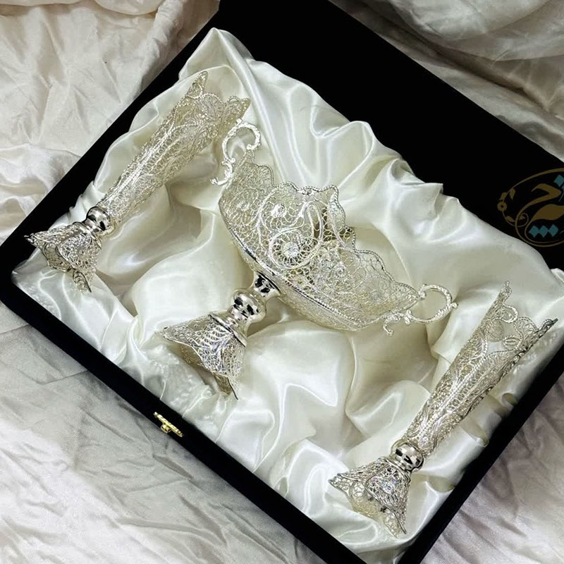 ست هدیه ظروف نقره ملیله کاری شکلات خوری و گلدان تنه خمری
