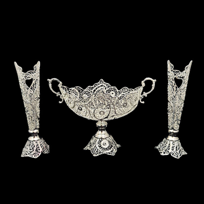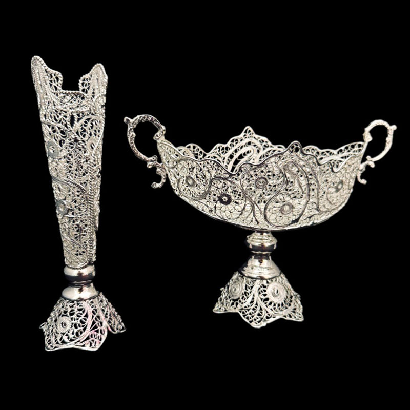 ست هدیه نقره گلدان ملیله کاری و قندان تاجی