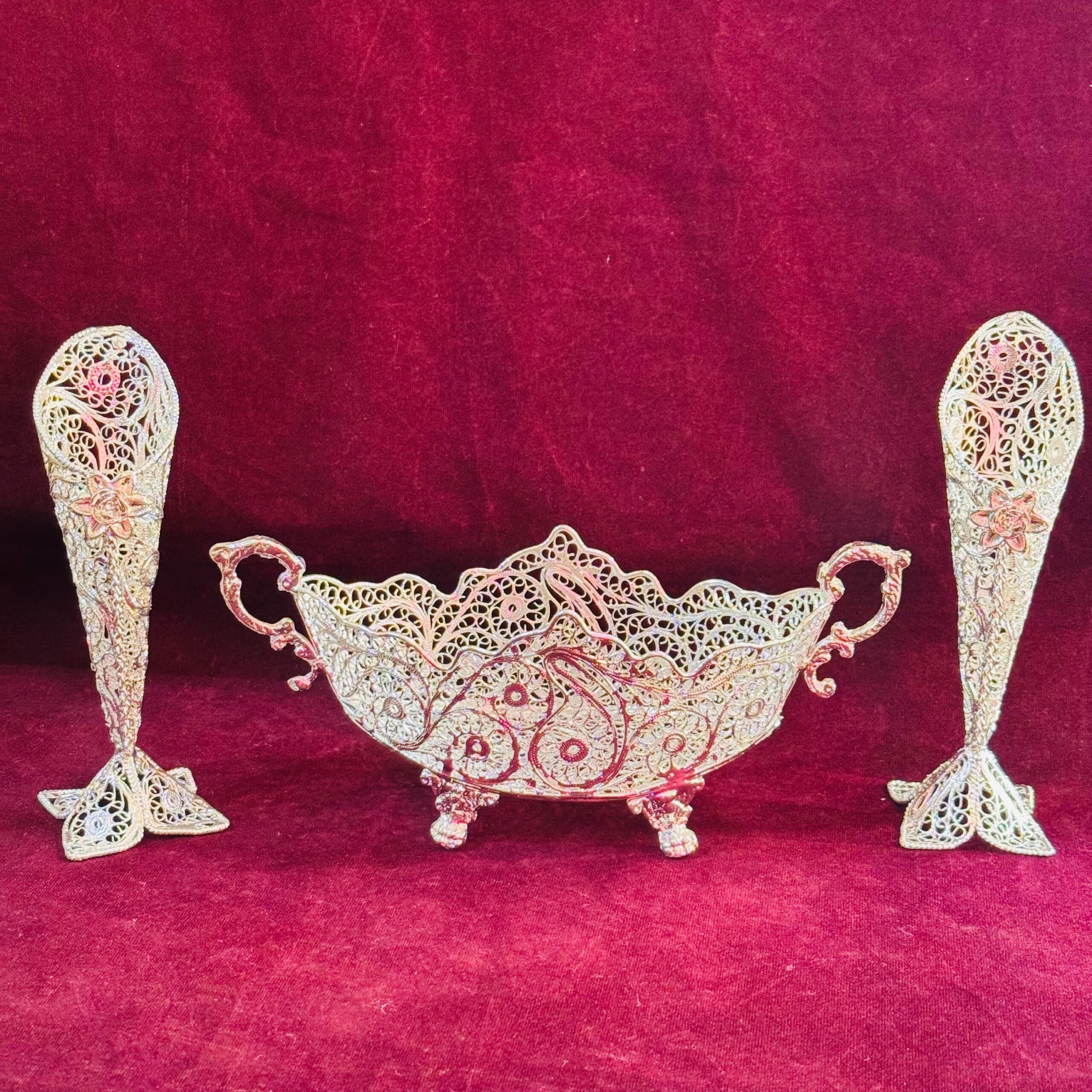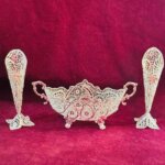 ظروف ملیله کاری کشکول قایقی پایه کوتاه و گلدان ملیله کاری – ملیله‌کاری اصفهان، اثری دست‌ساز از هنرمندان اصفهانی با ظرافت بالای ملیله‌کاری، مناسب برای دکوراسیون لوکس و هدیه‌ای ماندگار.