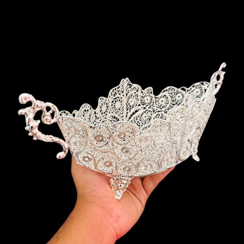 ملیله‌کاری، هنر ظریف و زیبای ساخت اشیاء تزئینی از مفتول‌های نازک مس با روکش نقره است که ریشه در تاریخ و فرهنگ اصفهان دارد. محصولات ملیله‌کاری با طرح‌های پیچیده و چشم‌نواز، جلوه‌ای خاص به دکوراسیون منزل می‌بخشند و می‌توانند به عنوان هدیه‌ای ارزشمند مورد استفاده قرار گیرند. کیفیت ملیله‌کاری تولیدی بُته چی به دلیل استفاده از مواد اولیه مرغوب و دقت بالای هنرمندان، از کیفیت بالایی برخوردار است و می‌تواند سال‌ها زیبایی خود را حفظ کند. ساخت ظروف ملیله‌کاری نیاز به مهارت و دقت بالایی دارد. در ابتدا، فلز مورد استفاده برای ساخت ظروف ملیله کاری به رشته‌های نازک و بسیار دقیق تبدیل می‌شود. سپس این رشته‌ها با دستان هنرمند به اشکال پیچیده و ظریف بافته می‌شوند. این رشته‌های فلزی پس از بافتن، به شکل یک ظرف با جزئیات دقیق و ظریف درمی‌آیند که اغلب با الگوهای گل و گیاه یا طرح‌های هندسی زینت داده می‌شوند. برای تکمیل کار، معمولاً این ظروف با استفاده از سنگ‌های قیمتی یا جواهرات دیگر تزئین می‌شوند تا جلوه‌ای خاص و نفیس پیدا کنند. با خرید ظروف ملیله کاری اصفهان، شما نه تنها یک شیء زیبا و دکوری را به خانه خود اضافه می‌کنید، بلکه از هنر و هنرمندان ایرانی نیز حمایت می‌کنید. به علت دست ساز بودن تمامی محصولات امکان اختلاف سایز اندکی وجود دارد.