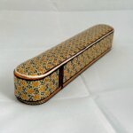 خاتم کاری هنر اصیل ایرانی و هنر انحصاری اصفهان است که با گذشت زمان کهنه نشده و تنوع کالایی آن به روز می شود. خاتم ترکیبی از فلزات گوناگون، چوب های خاص و استخوان های مختلف است. فلزاتی مانند مس و آلیاژهای مسی (برنز و برنج)، و چوب هایی مانند گردو، عناب و افرا، و استخوان های مانند استخوان شتر، گاو و اسب که به صورتی هنرمندانه برش خورده به شکل سیم هایی در کنار هم اشکال زیبای هندسی با ترکیبی از مثلث و چند ضلعی های گوناگون را پدید می آورد. این اشکال به صورت متقارن و یکدست کنار یکدیگر قرار می گیرند و به صورت روکشی زیبا و ظریف برای متریال مسی یا متریال چوب راش خودنمایی می کنند. در انتها روکش پلی استر اعلی روی محصولات خاتم کاری منجر به عدم تغییر رنگ، براقیت و استحکام بیشتر می شود. نوع خاتم اعلی و نقش های آن به صورت ریز و ظریف است. این اثر می تواند به عنوان هدیه ای فاخر و لاکچری برای افراد خاص یا برای استفاده در ویترین خانه به صورت دکوری و همچنین به صورت کاربردی مورد استفاده قرار بگیرد. دور از نور آفتاب نگهداری شود با دستمال خشک تمیز شود کیفیت عالی کار استاد کار ماهر چون این محصول کار دست هست ممکن هست کمی متفاوت در طرح و رنگ باشد.