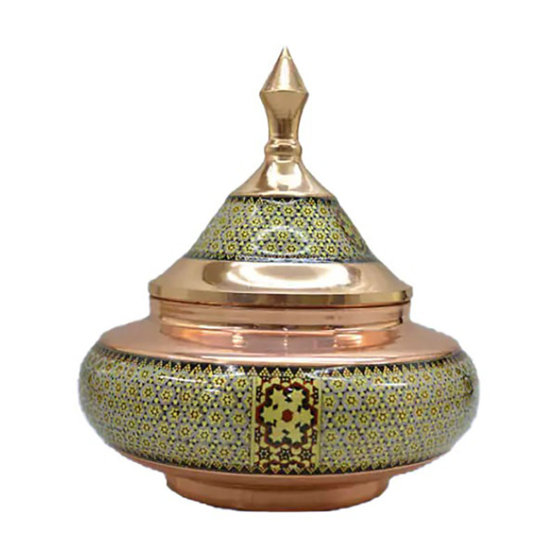جنس ظروف مس و خاتم از فلز مس بوده که بر روی آن خاتم اصل اصفهان چسبانده شده است. استفاده از خاتم اعلا و متریال باکیفیت باعث افزایش طول عمر و ماندگاری فوق العاده در ظروف مس و خاتم شده است. سایز بندی ظروف مس و خاتم به شما امکان استفاده آنها را در چیدمان های مختلف خواهد داد. ظروف مس و خاتم برای زیباسازی فضاهای دکوری در نظر گرفته می شود. از این رو می تواند با دیگر محصولات دکوری ست گردد. محصولات مس و خاتم اصفهان از محصولات هنری صنایع دستی نفیس ایرانی بشمار می رود. فلز مس مورد استفاده در این محصولات ضخامت بالا و مناسبی دارد و به شکل نهایی محصول جلوه خاصی بخشیده است. این محصول دارای لایهای محافظ با پلیاستر است که علاوه بر پوششدهی مناسب سطح مس و جلوگیری از اکسید و سیاه شدن، مقاومت آن را نیز بالا برده است. بسیاری از شرکت ها و سازمان ها بمنظور تهیه هدایای تبلیغاتی سالیانه خود از محصولات مس و خاتم اصفهان استفاده می کنند. قبل از سفارش طرح مورد نظرتون رو استعلام بگیرید و با اطمینان خرید کنید.