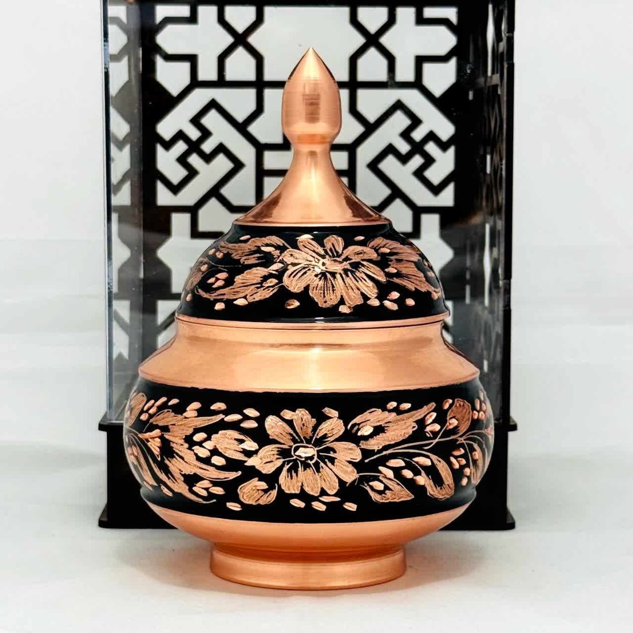 نکته : قیمت این محصول به همراه جعبه درج شده است. قندان مسی الماس تراش طرح گل و مرغ ارتفاع 16 سانتیمتر در سایز های (20،30،35و 40 ) هم موجود است.
