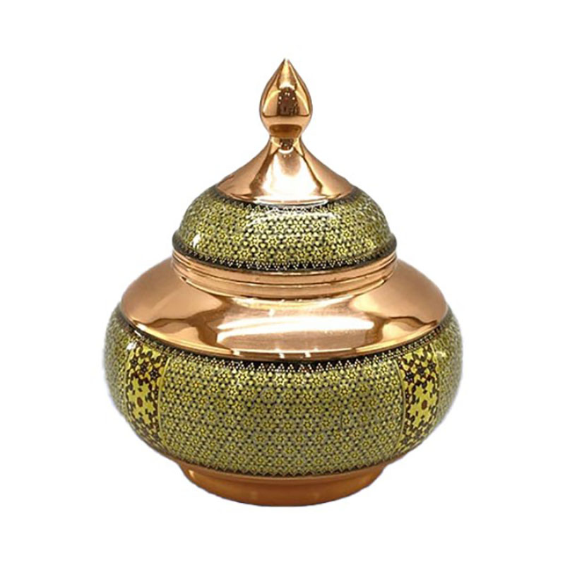 جنس ظروف مس و خاتم از فلز مس بوده که بر روی آن خاتم اصل اصفهان چسبانده شده است. استفاده از خاتم اعلا و متریال باکیفیت باعث افزایش طول عمر و ماندگاری فوق العاده در ظروف مس و خاتم شده است. سایز بندی ظروف مس و خاتم به شما امکان استفاده آنها را در چیدمان های مختلف خواهد داد. ظروف مس و خاتم برای زیباسازی فضاهای دکوری در نظر گرفته می شود. از این رو می تواند با دیگر محصولات دکوری ست گردد. محصولات مس و خاتم اصفهان از محصولات هنری صنایع دستی نفیس ایرانی بشمار می رود. فلز مس مورد استفاده در این محصولات ضخامت بالا و مناسبی دارد و به شکل نهایی محصول جلوه خاصی بخشیده است. این محصول دارای لایهای محافظ با پلیاستر است که علاوه بر پوششدهی مناسب سطح مس و جلوگیری از اکسید و سیاه شدن، مقاومت آن را نیز بالا برده است. بسیاری از شرکت ها و سازمان ها بمنظور تهیه هدایای تبلیغاتی سالیانه خود از محصولات مس و خاتم اصفهان استفاده می کنند. قبل از سفارش طرح مورد نظرتون رو استعلام بگیرید و با اطمینان خرید کنید
