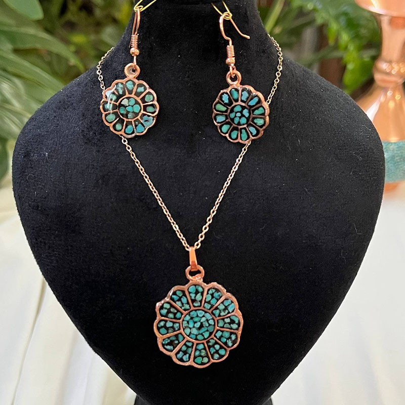 نیم ست زیورآلات مسی فیروزه کوبی مدل آفتابگردان نمونهای از هنر اصیل ایرانی است که با ظرافت و دقت فراوان تولید شده است.