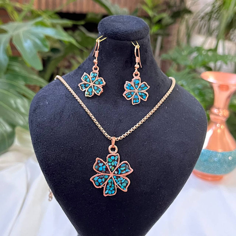 این نیم ست زیورآلات مسی فیروزه کوب شامل گردنبند با زنجیر نانو و یک جفت گوشواره مسی میباشد. البته به صورت نیم ست ارائه میشود.این ست از مس مرغوب کار شده است. یک جفت گوشواره مسی از همین مدل با قفل قلابی در این ست مسی موجود می باشد. همچنین پلاک مسی آن فیروزه کوب با این طرح و دارای زنجیر مسی مرغوب با قفل طوطی است. نکته : برروی تمامی زیورآلات جعبه هدیه 🎁 معمولی ارائه میگردد، شما میتوانید جعبه طرح های خاتم کاری را که تماما کار دست هنرمندان اصفهان است هم انتخاب کنید.