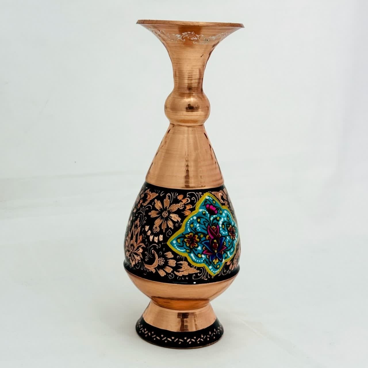 گلدان مسی الماس تراش طرح گل و مرغ ارتفاع 20 سانتیمتر در سایز های متنوع هم موجود است.