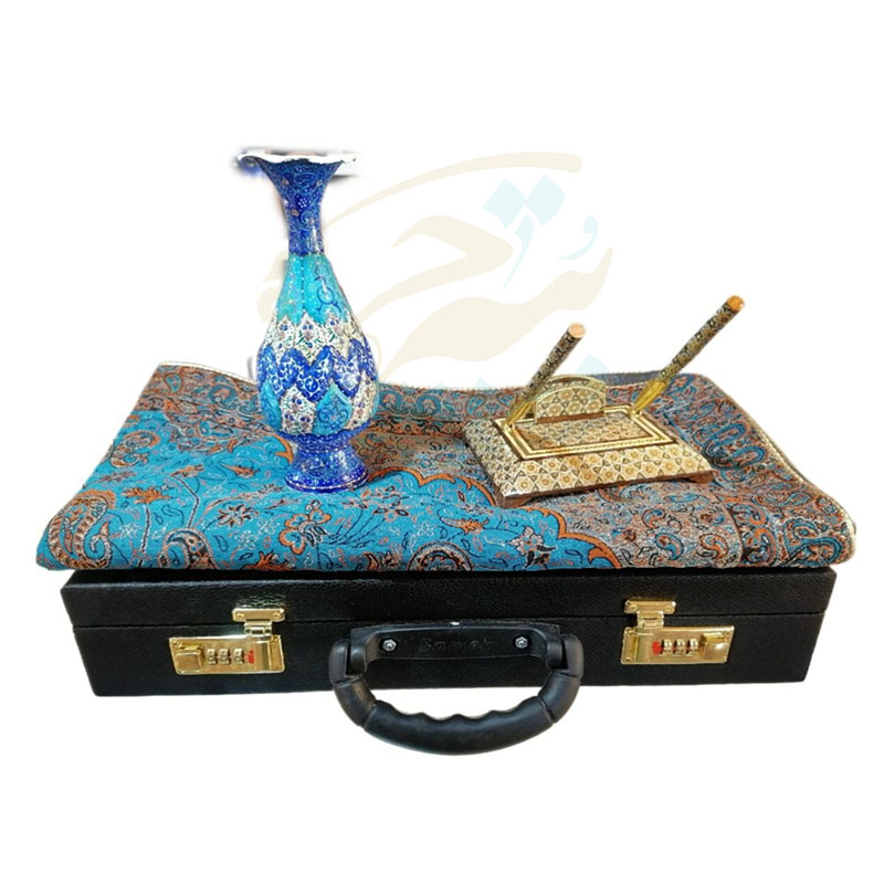 ست مورد نظر 4 تیکه هست و شامل : گلدان میناکاری 20 سانتی (7در7در20سانتی متر) ، ترمه ی رومیزی اصفهان ابعاد 80در80 سانتی متر مربعی، جاقلمی خاتم کاری اصفهان 11در15 سانتی متر و دوعدد خودکار خاتم کاری نفیس اصفهان که همه با جعبه ای شکیل تقدیم شما عزیزان می شود.