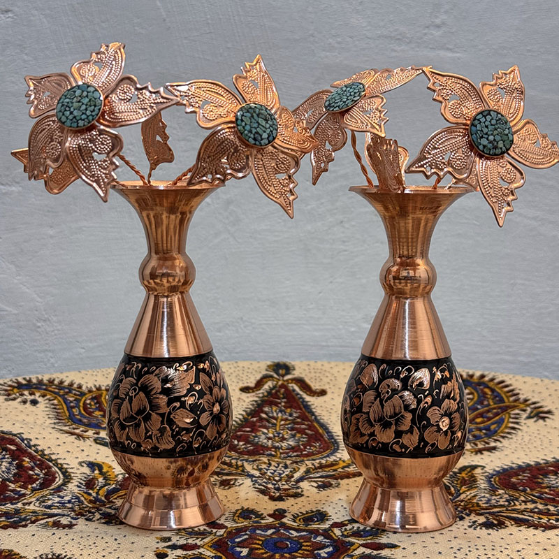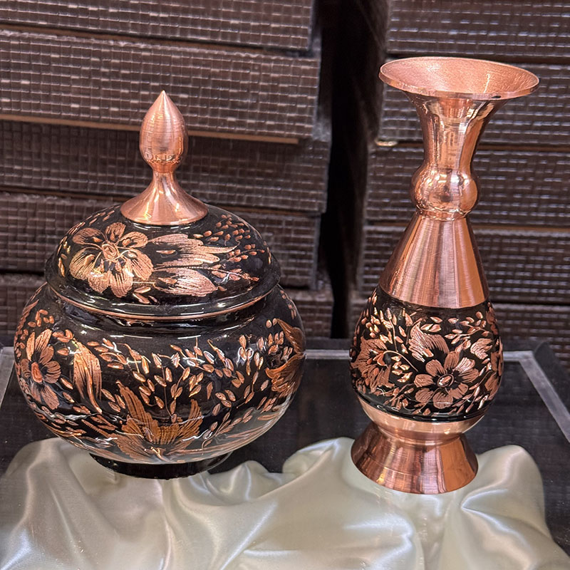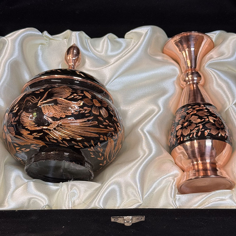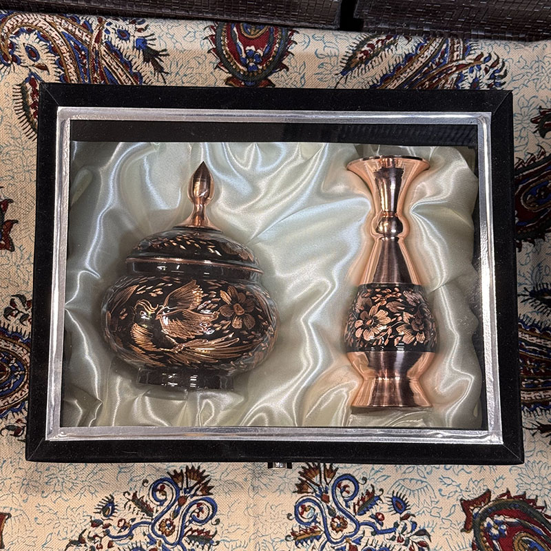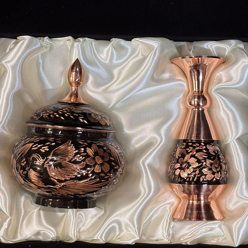 ست هدیه گلدان و شکلات خوری الماس تراش مسی، هدیه ای خاص برای دوس داران صنایع دستی اصفهان میباشد. گلدان مسی الماس تراش طرح گل و مرغ ارتفاع 16 سانتیمتر و قندان 16 سانتی به همراه جعبه 30در30 سانت ارائه شده است. در سایز های متنوع هم موجود است.
