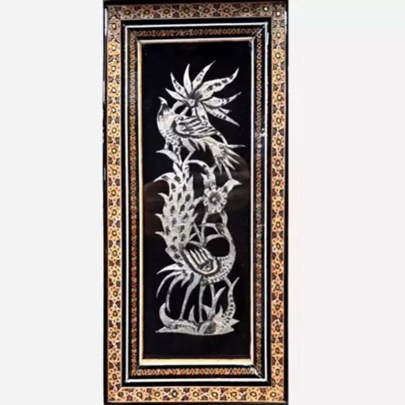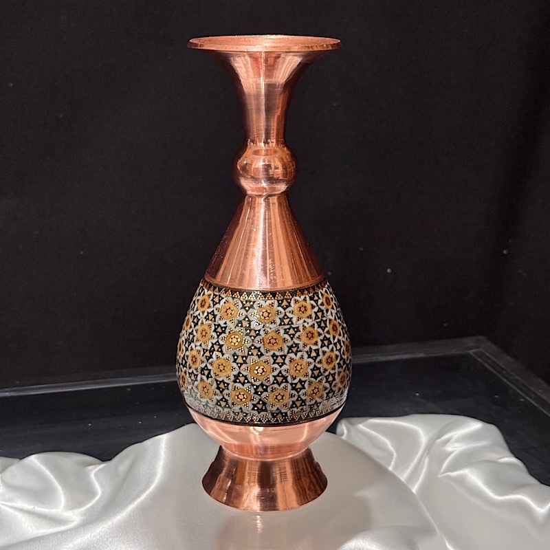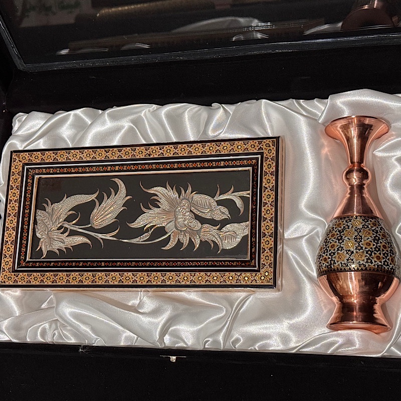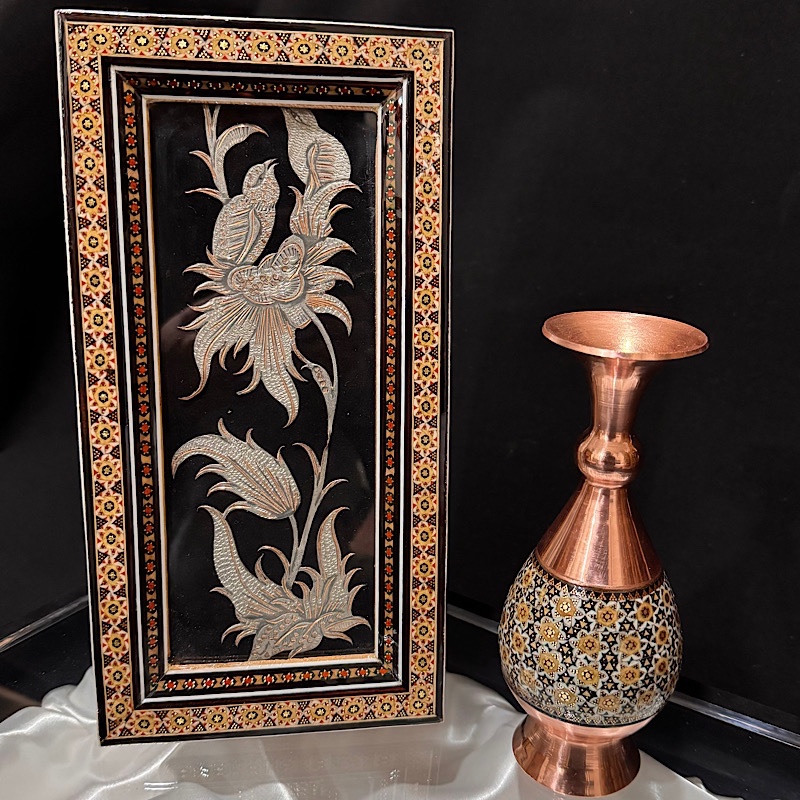 20 سانت ارتفاع گلدان و تابلو 15در30 سانت قلمروی با قاب خاتم کاری اعلا گلدان مس و خاتم (روکش نانو پلی استر برای تثبیت رنگ) نکته:قیمت به همراه جعبه مخمل هدیه ای که درب آن شیشه ای است درج شده است .