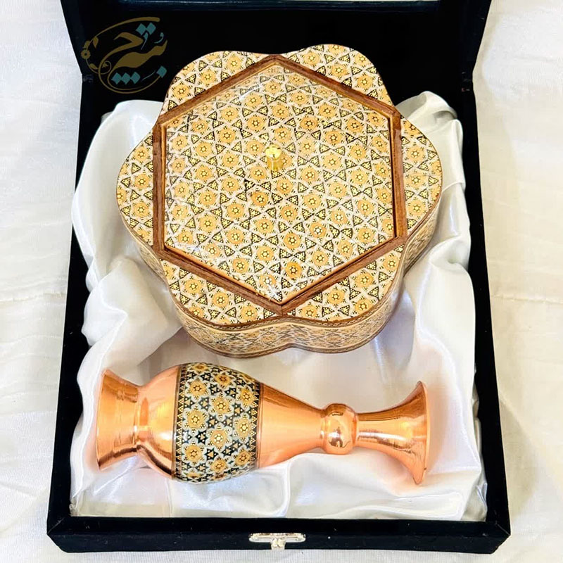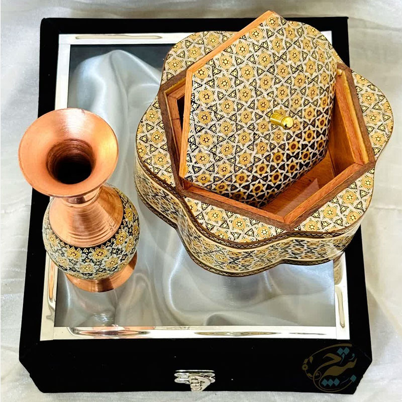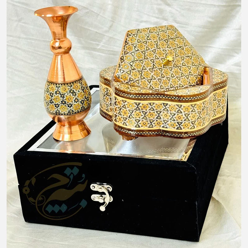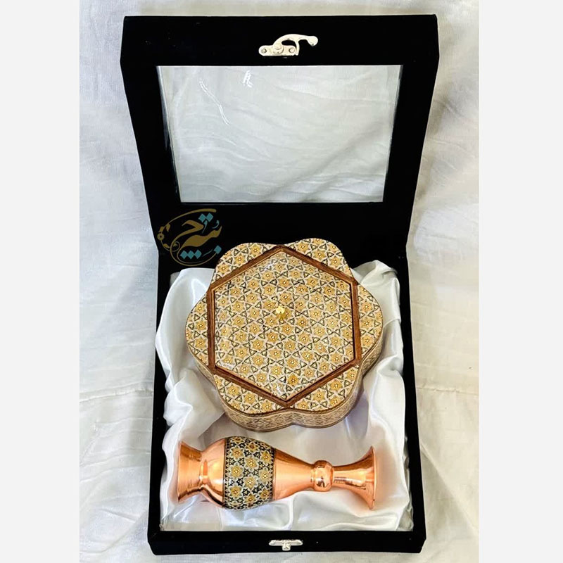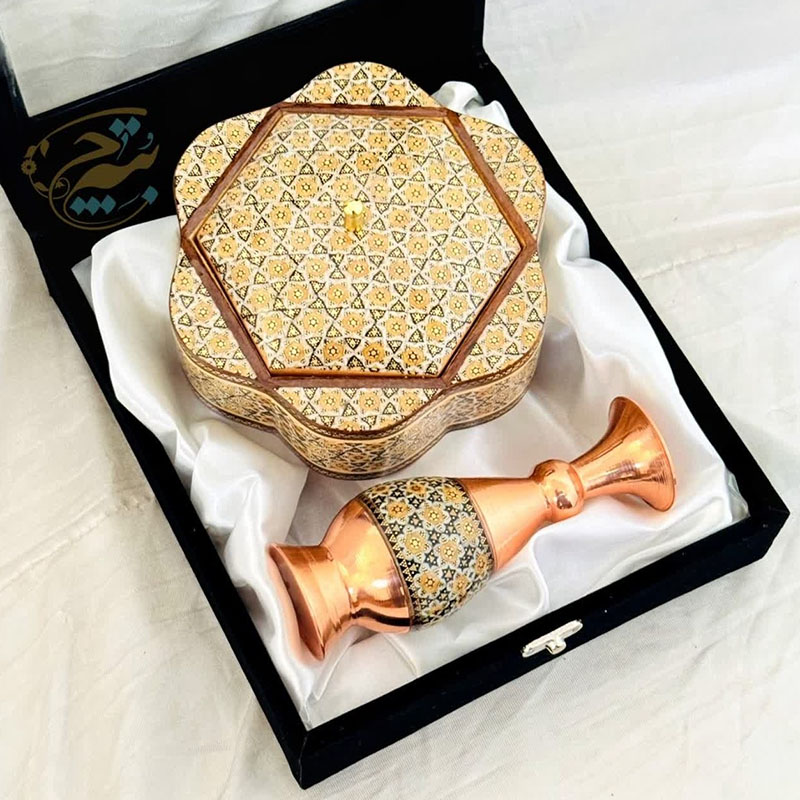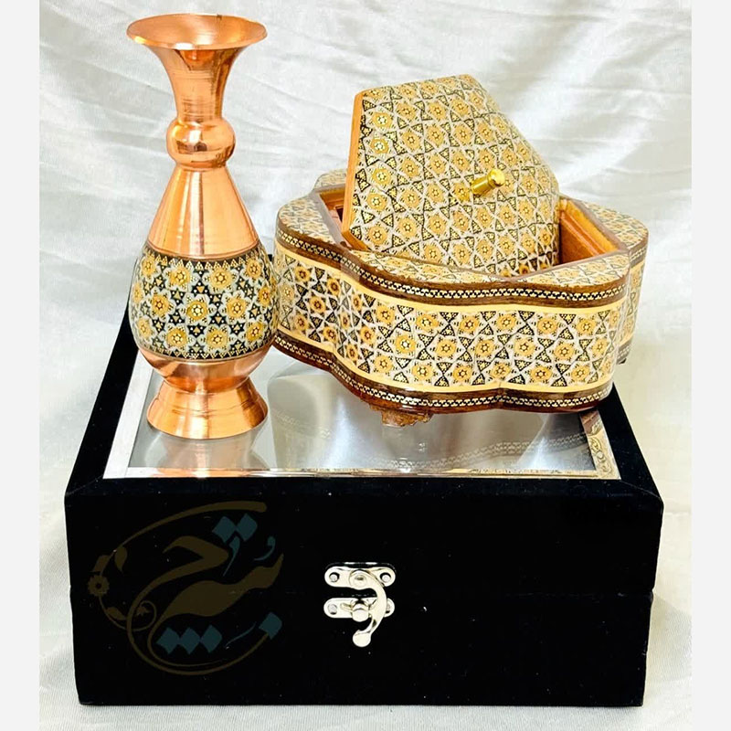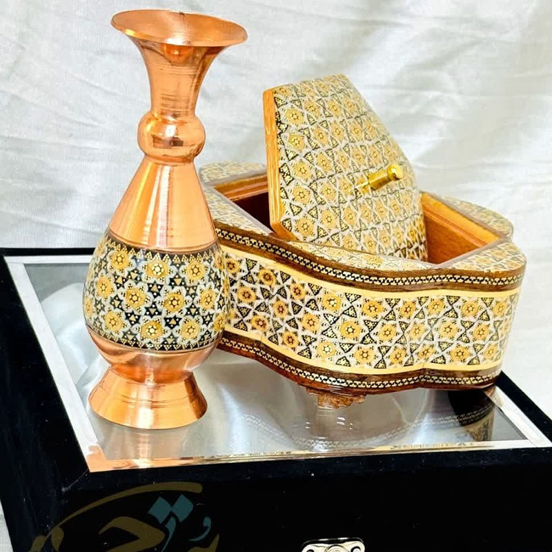 جنس ظروف مس و خاتم از فلز مس بوده که بر روی آن خاتم اصل اصفهان چسبانده شده است. استفاده از خاتم اعلا و متریال باکیفیت باعث افزایش طول عمر و ماندگاری فوق العاده در ظروف مس و خاتم شده است. سایز بندی ظروف مس و خاتم به شما امکان استفاده آنها را در چیدمان های مختلف خواهد داد. ظروف مس و خاتم برای زیباسازی فضاهای دکوری در نظر گرفته می شود. از این رو می تواند با دیگر محصولات دکوری ست گردد. محصولات مس و خاتم اصفهان از محصولات هنری صنایع دستی نفیس ایرانی بشمار می رود. فلز مس مورد استفاده در این محصولات ضخامت بالا و مناسبی دارد و به شکل نهایی محصول جلوه خاصی بخشیده است. این محصول دارای لایهای محافظ با پلیاستر است که علاوه بر پوششدهی مناسب سطح مس و جلوگیری از اکسید و سیاه شدن، مقاومت آن را نیز بالا برده است. بسیاری از شرکت ها و سازمان ها بمنظور تهیه هدایای تبلیغاتی سالیانه خود از محصولات مس و خاتم اصفهان استفاده می کنند. قبل از سفارش طرح مورد نظرتون رو استعلام بگیرید و با اطمینان خرید کنید.