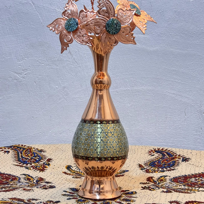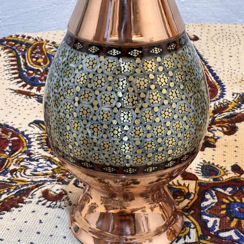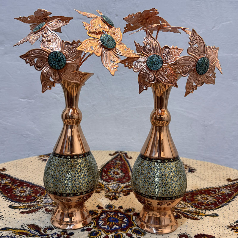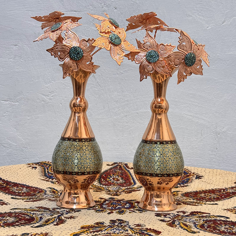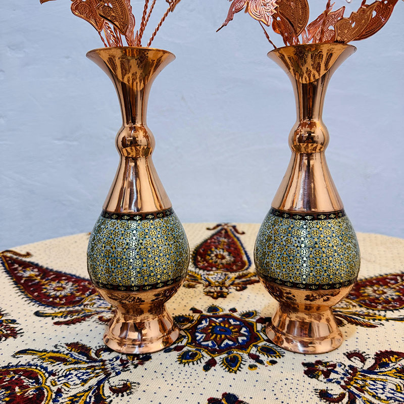 اگر به دنبال هدیهای ارزشمند برای یکی از عزیزانتان هستید یا میخواهید تغییری چشمگیر در دکوراسیون منزل ایجاد کنید، این ست نفیس خاتم کاری میتواند نگاه هر بینندهای را خیره کند. جنس بدنه این ست گلدان 20 سانتیمتری از مس است که بخشهایی از سطح آن خاتم کاری شده است. همنشینی دو رنگ مسی و طلایی در این ست، علاوه بر اینکه کنتراست زیبایی ایجاد کرده، با درخشش خود زینت بخش میز پذیرایی شماست.