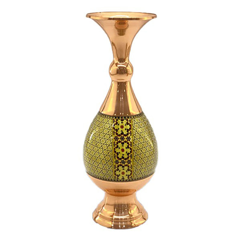 گلدان صراحی خاتم کاری محصولی زیبا و چشم نواز تولید شده در صنایع دستی خاتم ترکیبی است از چند ضلعیهای منظم با تعداد اضلاع متفاوت که با استفاده از مواد اولیه گوناگون مثل چوب ، فلز برنج و استخوان شتر در رنگهای مختلف تشکیل میشود. پنج، شش، هفت، هشت یا ده ضلعی است. ابعاد 25 × 9 سانتیمتر