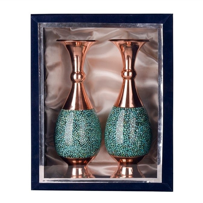 گلدان فیروزه کوبی مسی 30 سانتی جفتی با جعبه مخمل