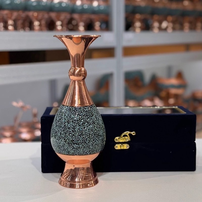 خانه / صنایع فلزی / مس و فیروزه کوبی / گلدان فیروزه کوبی / گلدان فیروزه کوبی 30 سانتی به همراه جعبه مخمل