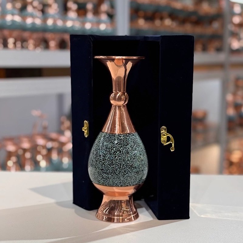 این کار نفیس فیروزه کوبی دارای پوششی از پلی استر است که علاوه بر پوششدهی مناسب سطح مس و جلوگیری از اکسید و سیاه شدن، مقاومت آن را نیز بالا برده است.از آنجاییکه پرداخت نهایی در تولید این کار ماهرانه و با دقت صورت گرفته،سطح مس و فیروزه براق، شفاف و درخشان است. فیروزه کوبی : فیروزه کوبی از صنایع دستی است و با نشاندن قطعه های کوچک سنگ فیروزه به حالت موزاییکی بر سطح ظرف ها ، زیورآلات و اشیای تزئینی ( از پایه هایی به جنس های مسی ، برنجی، نقره، ورشویی ویا برنزی) ساخته می شود . هر چه ظرف فیروزه کوبی شده پر کارتر و منظم تر باشد و فاصله کمتری بین قطعات فیروزه باشد ، ارزش هنری آن بیشتر است . امروزه اصفهان مرکزاین هنر است .