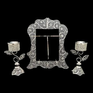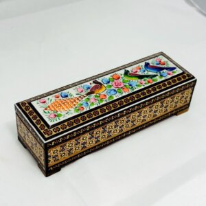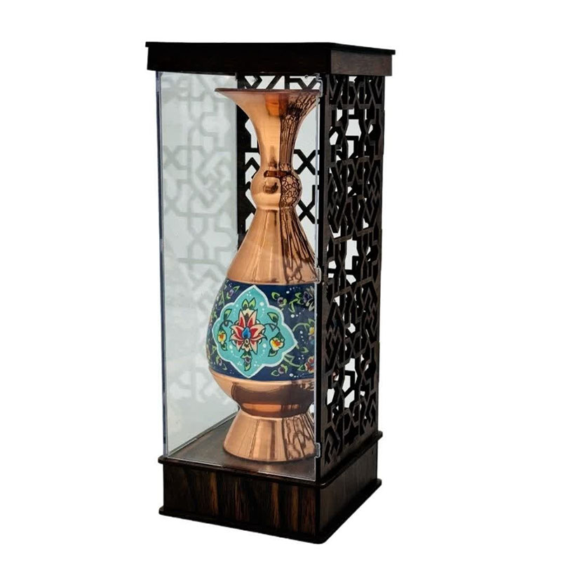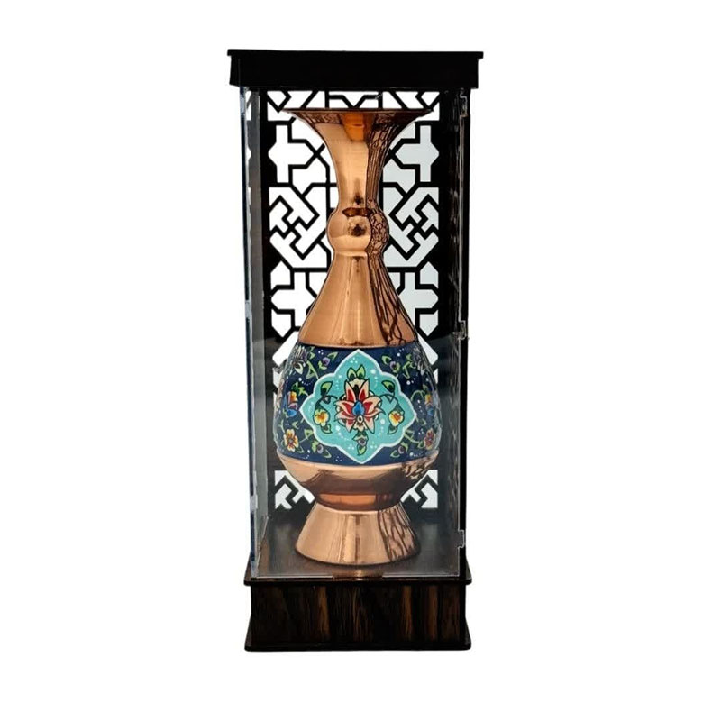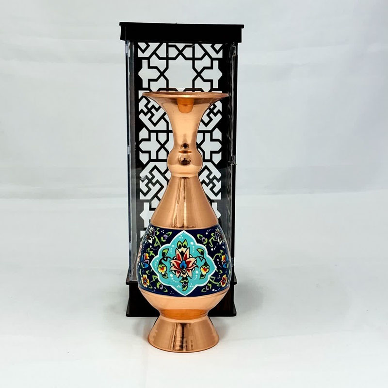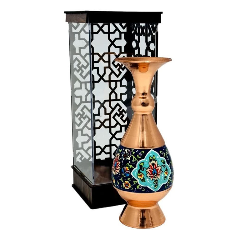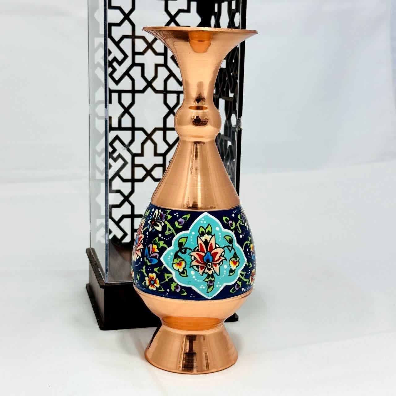 همنشینی دو رنگ متضاد زیبای مس در کنار آبی لاجوردی و فیروزه ای باعث چشم نوازی این گلدان مسی و نقاشی های روی آن شده است. فلز مس مورد استفاده در این گلدان ضخامت بالا و مناسبی دارد و به شکل نهایی محصول جلوه خاصی بخشیده است. این گلدان مسی نقاشی دارای لایهای محافظ با پلیاستر است که علاوه بر پوششدهی مناسب سطح مس و جلوگیری از اکسید و سیاه شدن، مقاومت آن را نیز بالا برده است. “مس و پرداز ” یک نوآوری در زمینه صنایع دستی می باشد که قسمتی از بدنه مسی محصول، نقاشی شده و جلوه زیبایی به آن می بخشد. جنس بدنه این ظروف از فلز مس است. برای ساخت قسمتی از ظرف و نه تمام بدنه، با رنگهای فیروزه ای و لاجوردی توسط هنرمند ماهر با گل های سنتی شاه عباسی که یادآور فرهنگ اصیل ایرانی است، نقاشی میشود.
