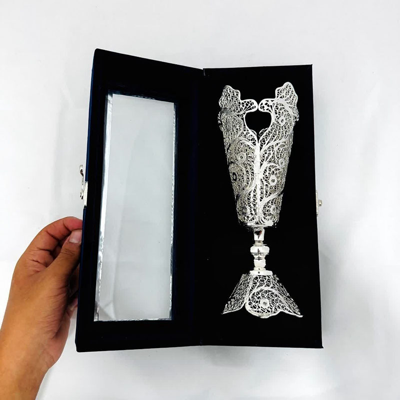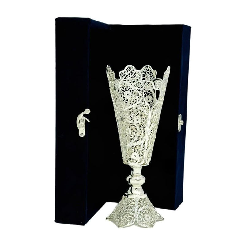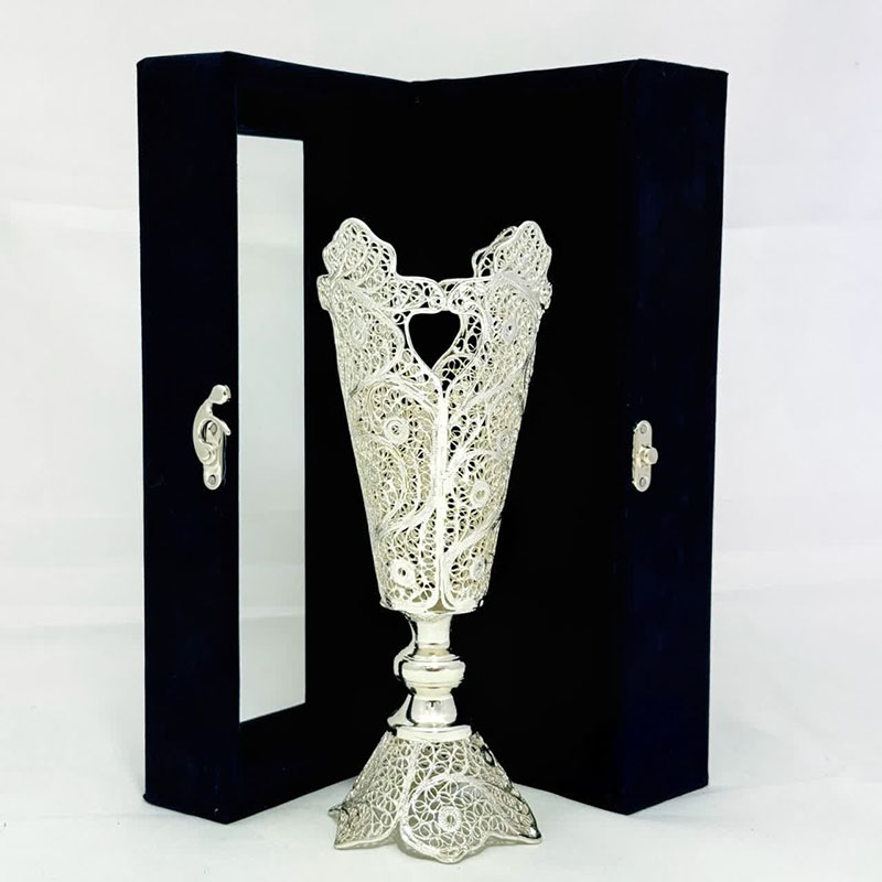 نکته : قیمت برای یک گلدان و جعبه مخمل دست ساز میباشد. ملیلهکاری، هنر ظریف و زیبای ساخت اشیاء تزئینی از مفتولهای نازک مس با روکش نقره است که ریشه در تاریخ و فرهنگ اصفهان دارد. محصولات ملیلهکاری با طرحهای پیچیده و چشمنواز، جلوهای خاص به دکوراسیون منزل میبخشند و میتوانند به عنوان هدیهای ارزشمند مورد استفاده قرار گیرند. کیفیت ملیلهکاری تولیدی بُته چی به دلیل استفاده از مواد اولیه مرغوب و دقت بالای هنرمندان، از کیفیت بالایی برخوردار است و میتواند سالها زیبایی خود را حفظ کند. با خرید گلدان ملیله کاری اصفهان، شما نه تنها یک شیء زیبا و دکوری را به خانه خود اضافه میکنید، بلکه از هنر و هنرمندان ایرانی نیز حمایت میکنید. به علت دست ساز بودن تمامی محصولات امکان اختلاف سایز اندکی وجود دارد.