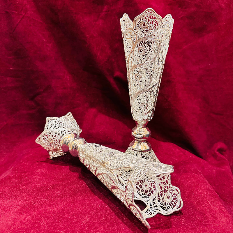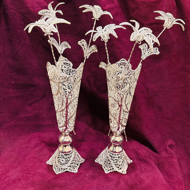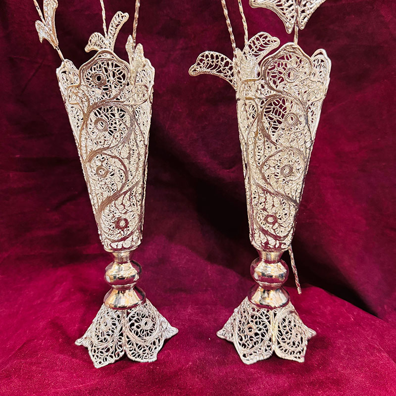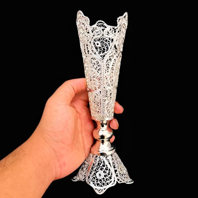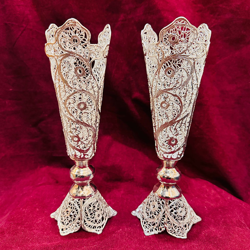 نکته : قیمت برای یک جفت گلدان میباشد. ملیلهکاری، هنر ظریف و زیبای ساخت اشیاء تزئینی از مفتولهای نازک مس با روکش نقره است که ریشه در تاریخ و فرهنگ اصفهان دارد. محصولات ملیلهکاری با طرحهای پیچیده و چشمنواز، جلوهای خاص به دکوراسیون منزل میبخشند و میتوانند به عنوان هدیهای ارزشمند مورد استفاده قرار گیرند. کیفیت ملیلهکاری تولیدی بُته چی به دلیل استفاده از مواد اولیه مرغوب و دقت بالای هنرمندان، از کیفیت بالایی برخوردار است و میتواند سالها زیبایی خود را حفظ کند. با خرید گلدان ملیله کاری اصفهان، شما نه تنها یک شیء زیبا و دکوری را به خانه خود اضافه میکنید، بلکه از هنر و هنرمندان ایرانی نیز حمایت میکنید. به علت دست ساز بودن تمامی محصولات امکان اختلاف سایز اندکی وجود دارد.
